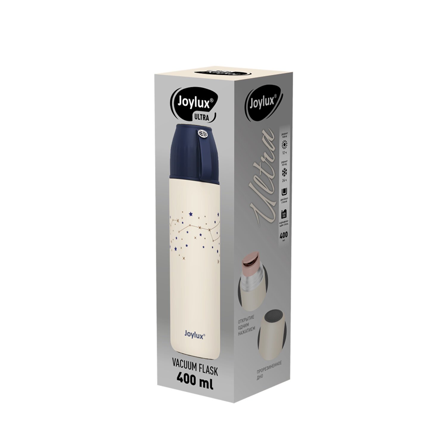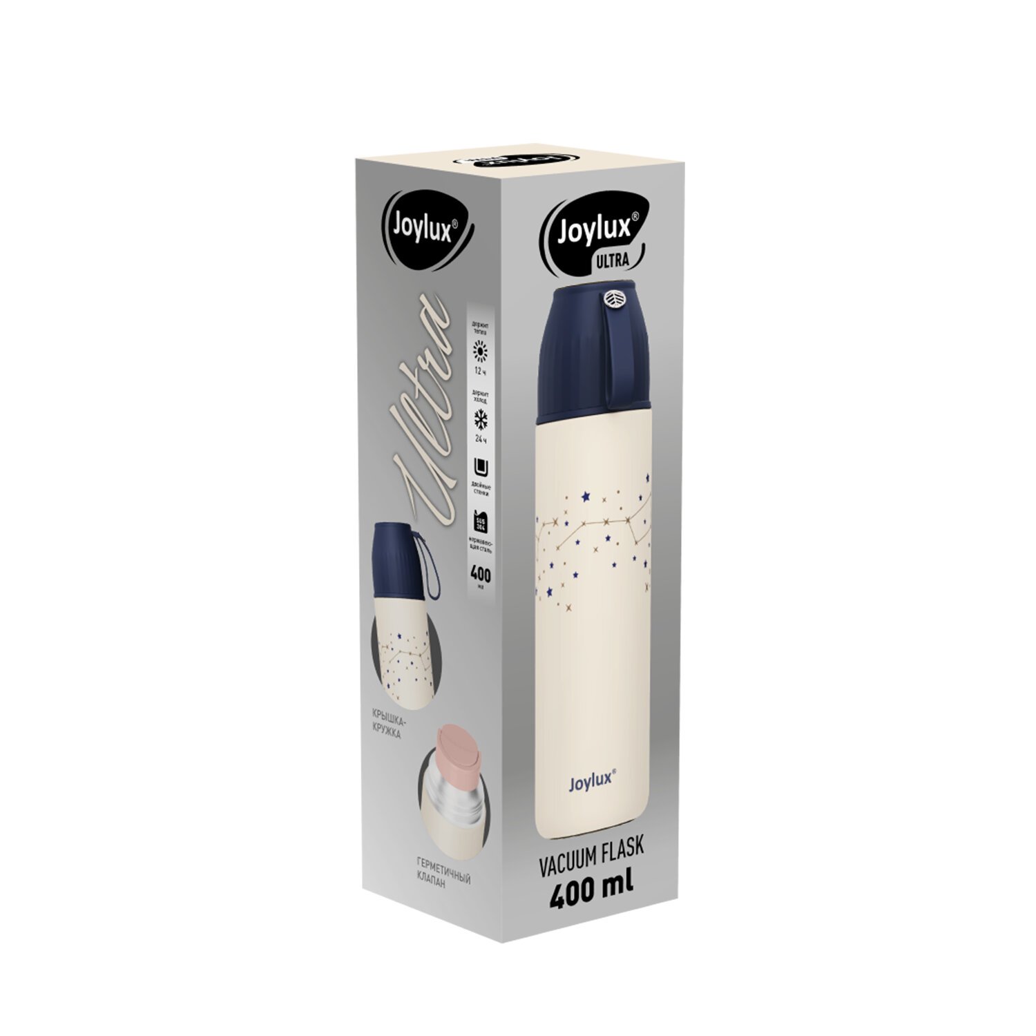 Термос 0,4 л JOYLUX ULTRA, нерж. сталь SUS304, крышка/кружка + ремешок, звезды, 700311