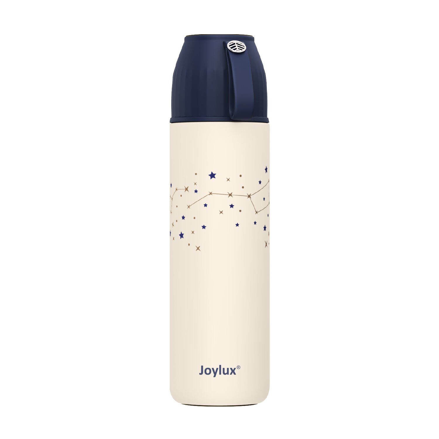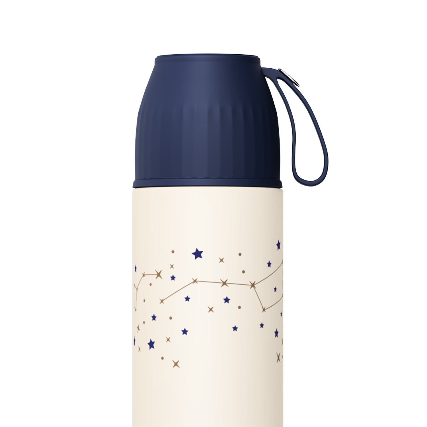 Практичность модели дополнена функциональными элементами: пластиковая крышка может использоваться как отдельная кружка, а удобный ремешок облегчает переноску термоса. Особого внимания заслуживает винтовая пробка со специальной кнопкой?клапаном — она позволяет наливать напиток, не открывая крышку полностью. Завершает образ стильный дизайн: корпус украшен принтом со звёздами в сине?золотой гамме металлик, что придаёт термосу неповторимый, запоминающийся облик.