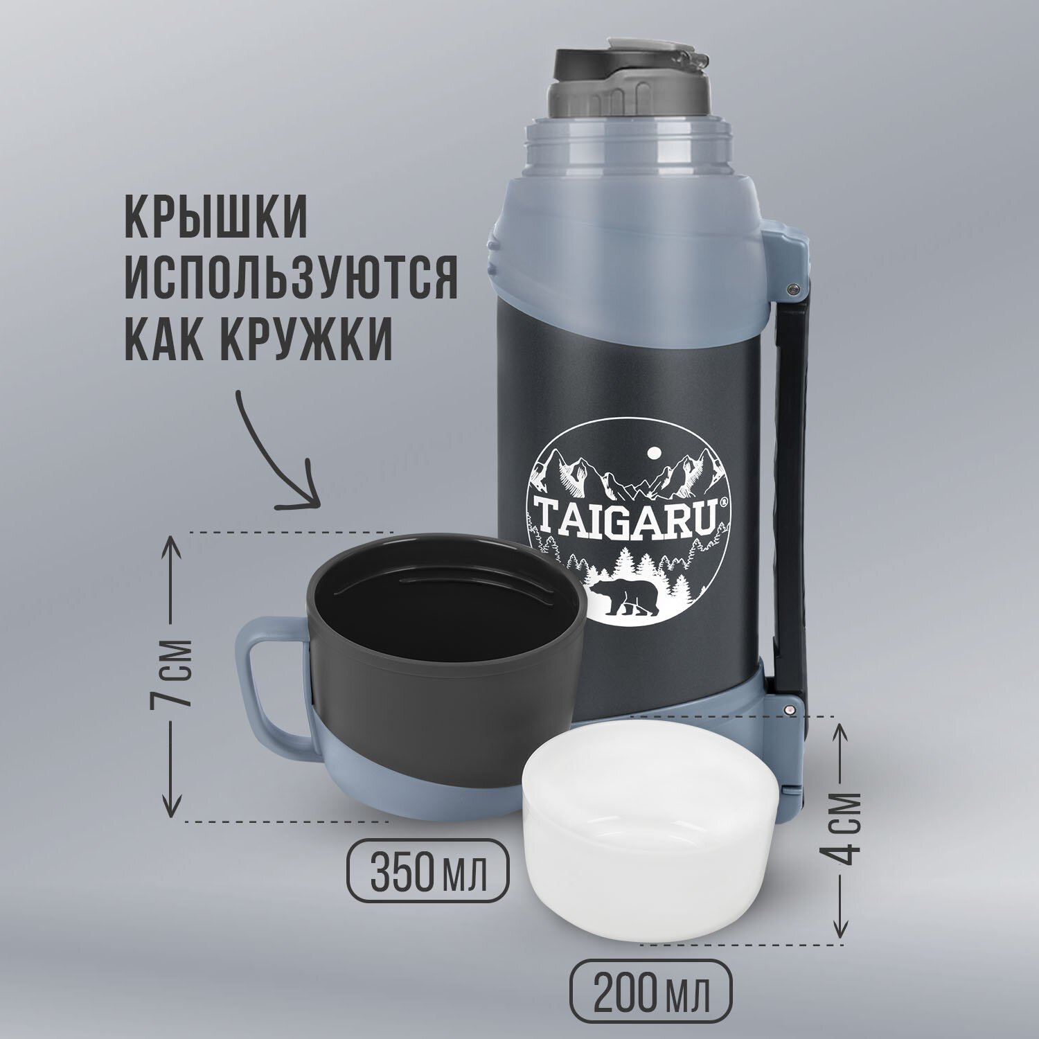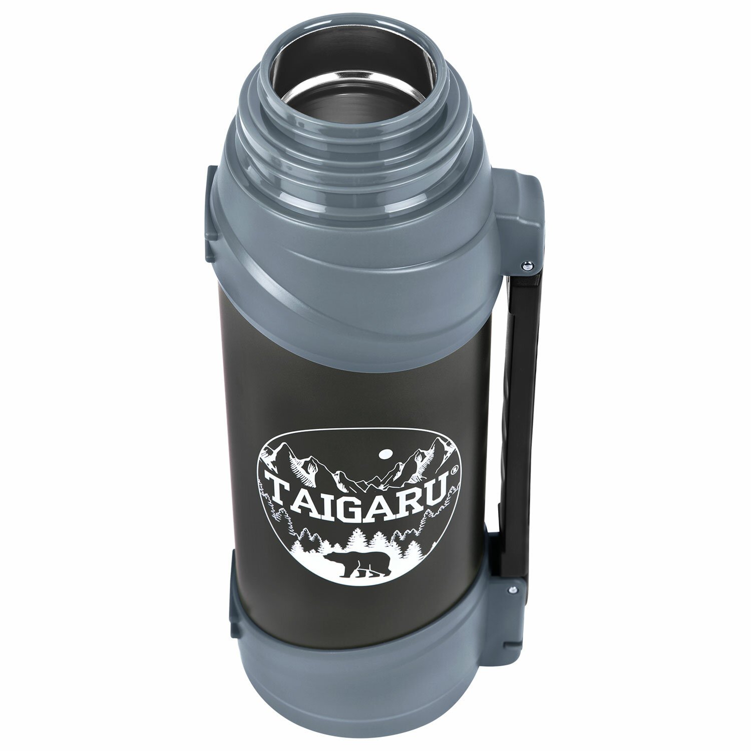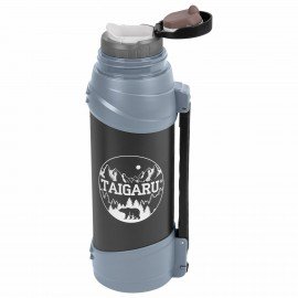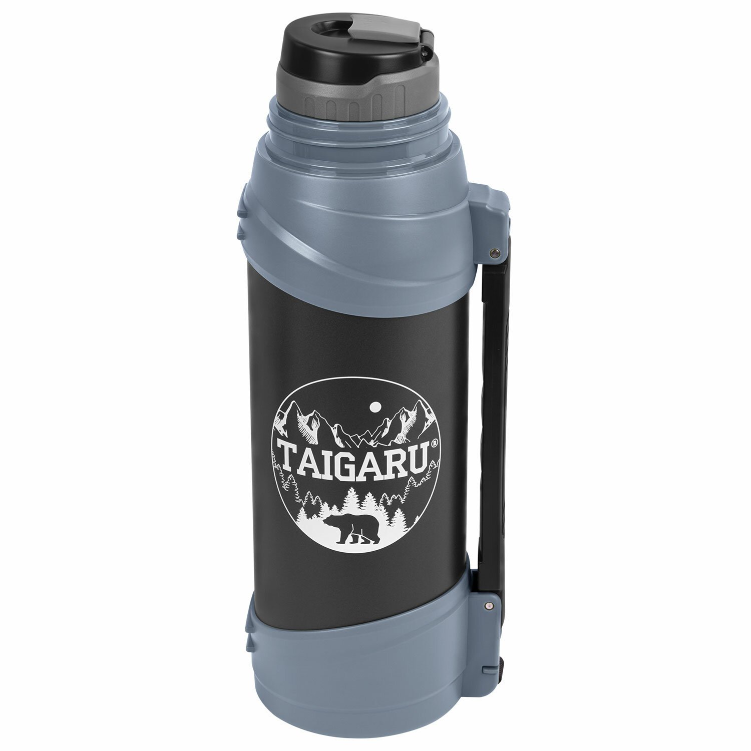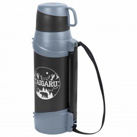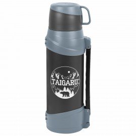 Термос классический, нержавеющая сталь 2 л, черно-серый, 2 кружки, ручка + ремешок, TAIGARU, 608818