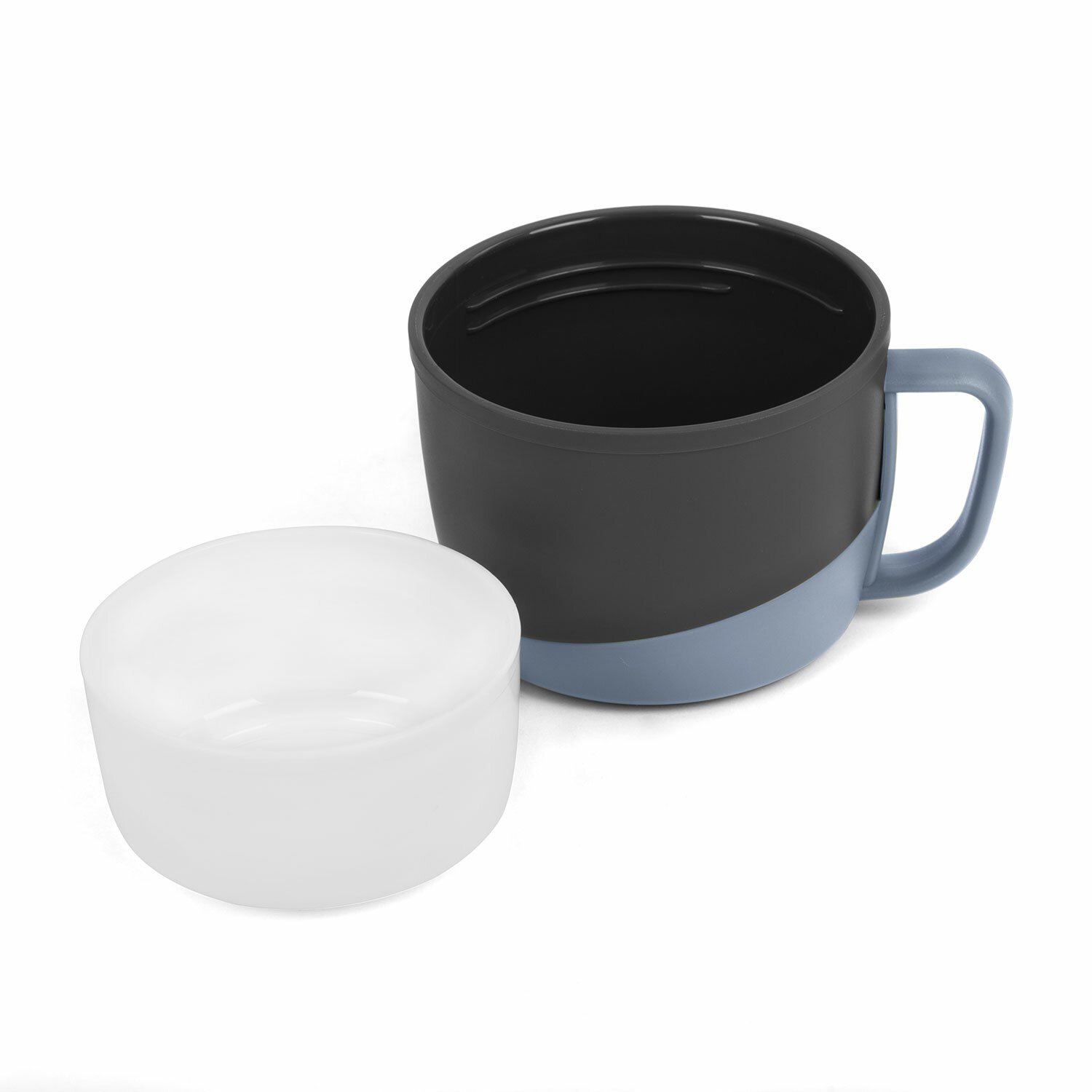 Комплектация включает в себя две удобные чашки. Помимо крышки, используемой как основная кружка с ручкой, имеется дополнительная внутренняя крышка.