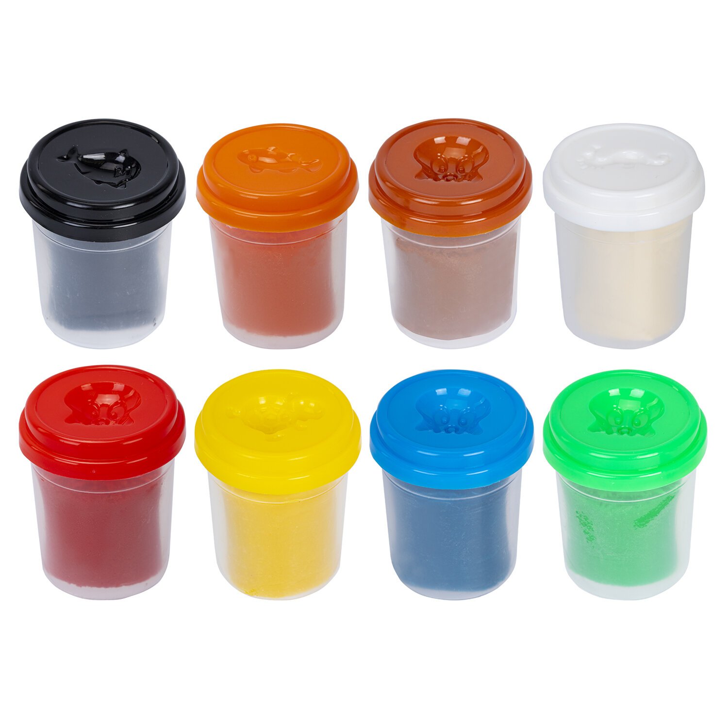 В набор входят 8 баночек теста для лепки ярких классических цветов: красный, синий, желтый, зеленый, оранжевый, коричневый, белый, черный. Цвета можно смешивать между собой и получать новые оттенки.