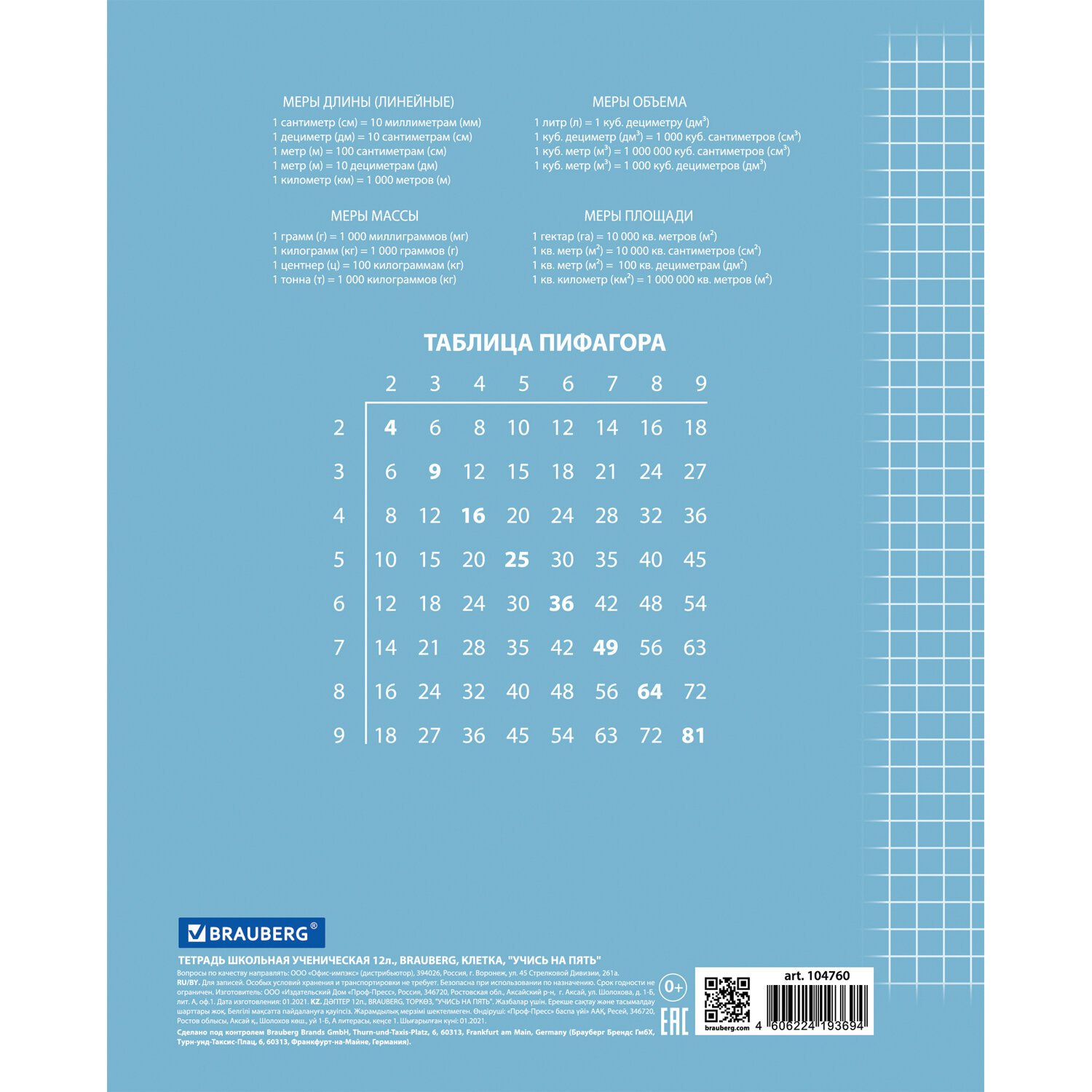 Тетрадь 12 л. BRAUBERG ЭКО "5-КА", клетка, обложка плотная мелованная бумага, СИНЯЯ, 104760