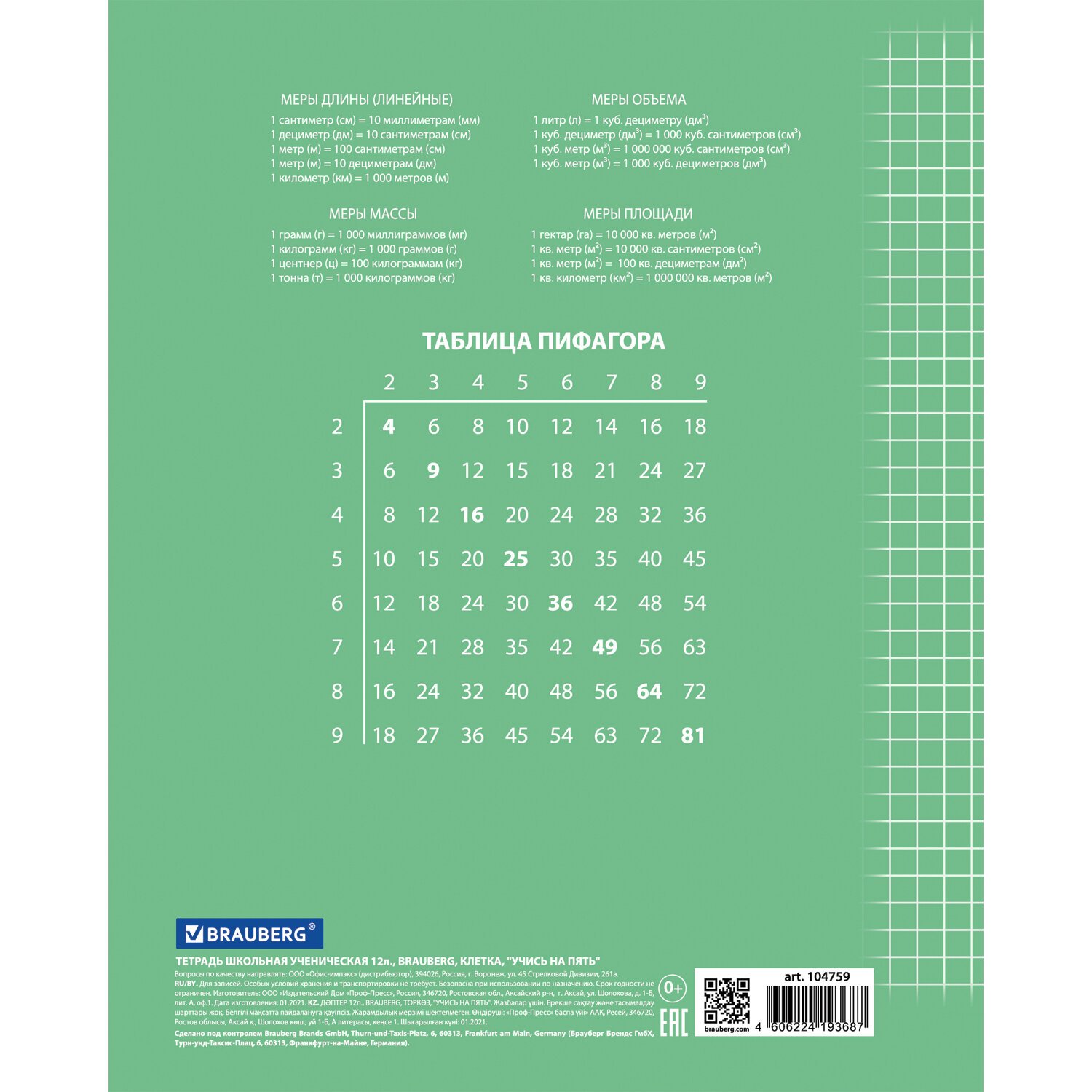 Тетрадь 12 л. BRAUBERG ЭКО "5-КА", клетка, обложка плотная мелованная бумага, ЗЕЛЕНАЯ, 104759
