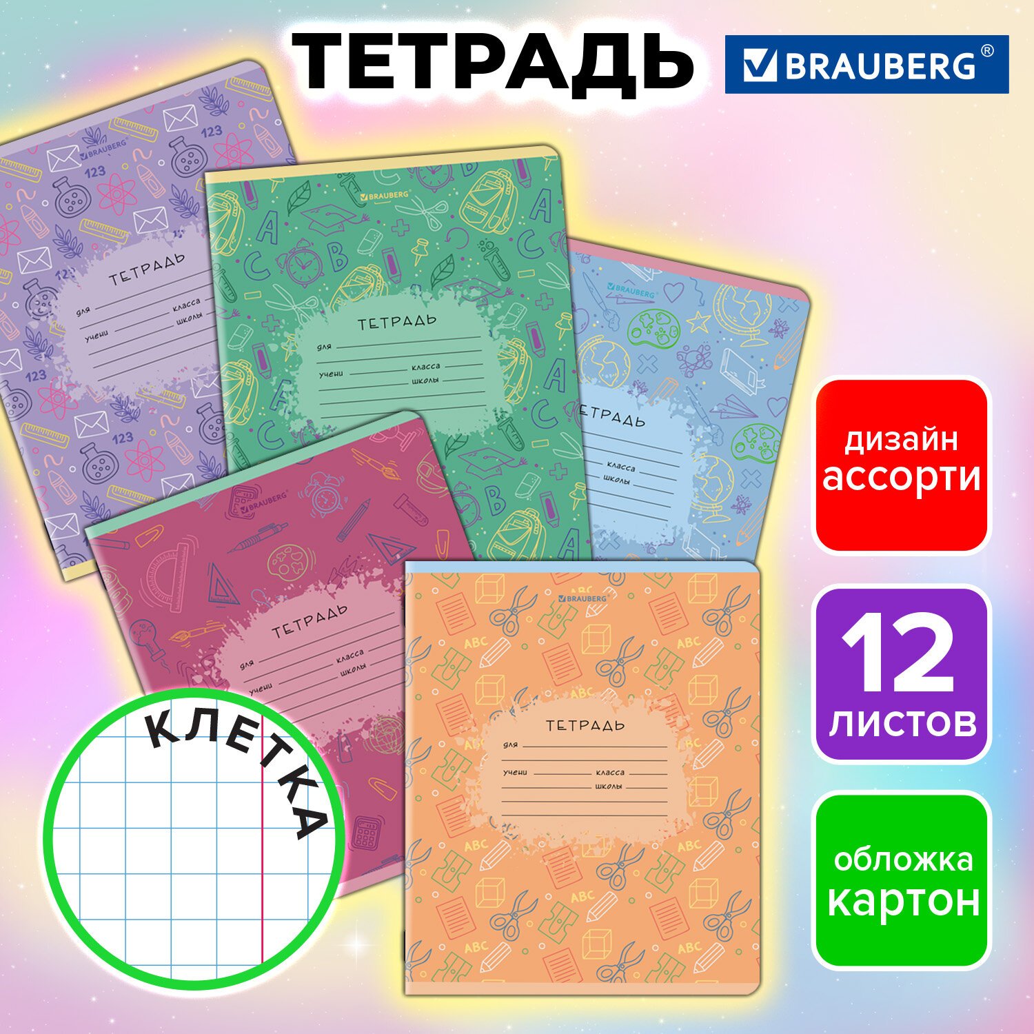 Тетрадь 12 л. BRAUBERG клетка, обложка картон, МИКС-4, 107276