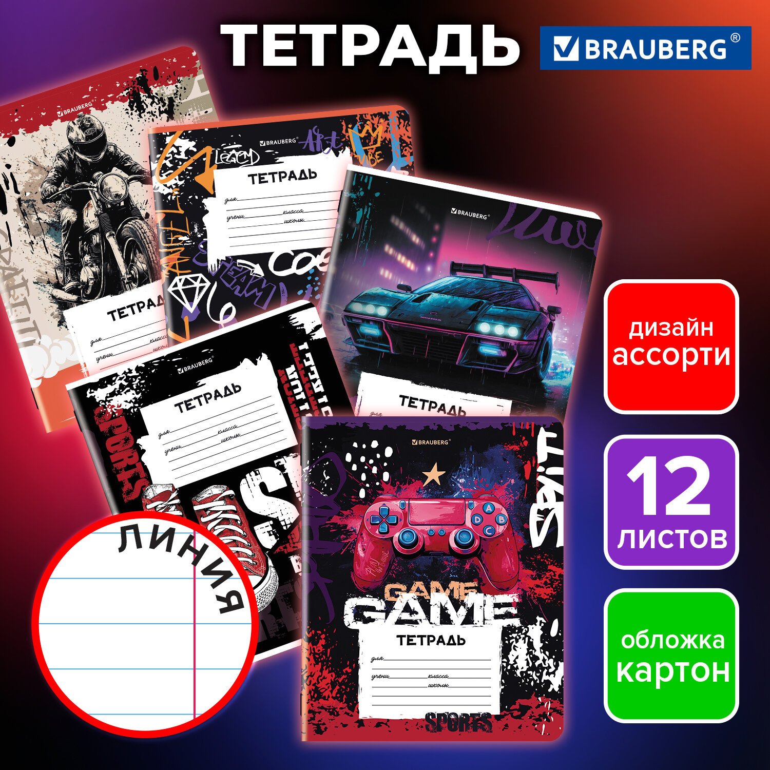 Тетрадь 12 л. BRAUBERG КЛАССИКА, линия, обложка картон, АССОРТИ (5 видов), 103274