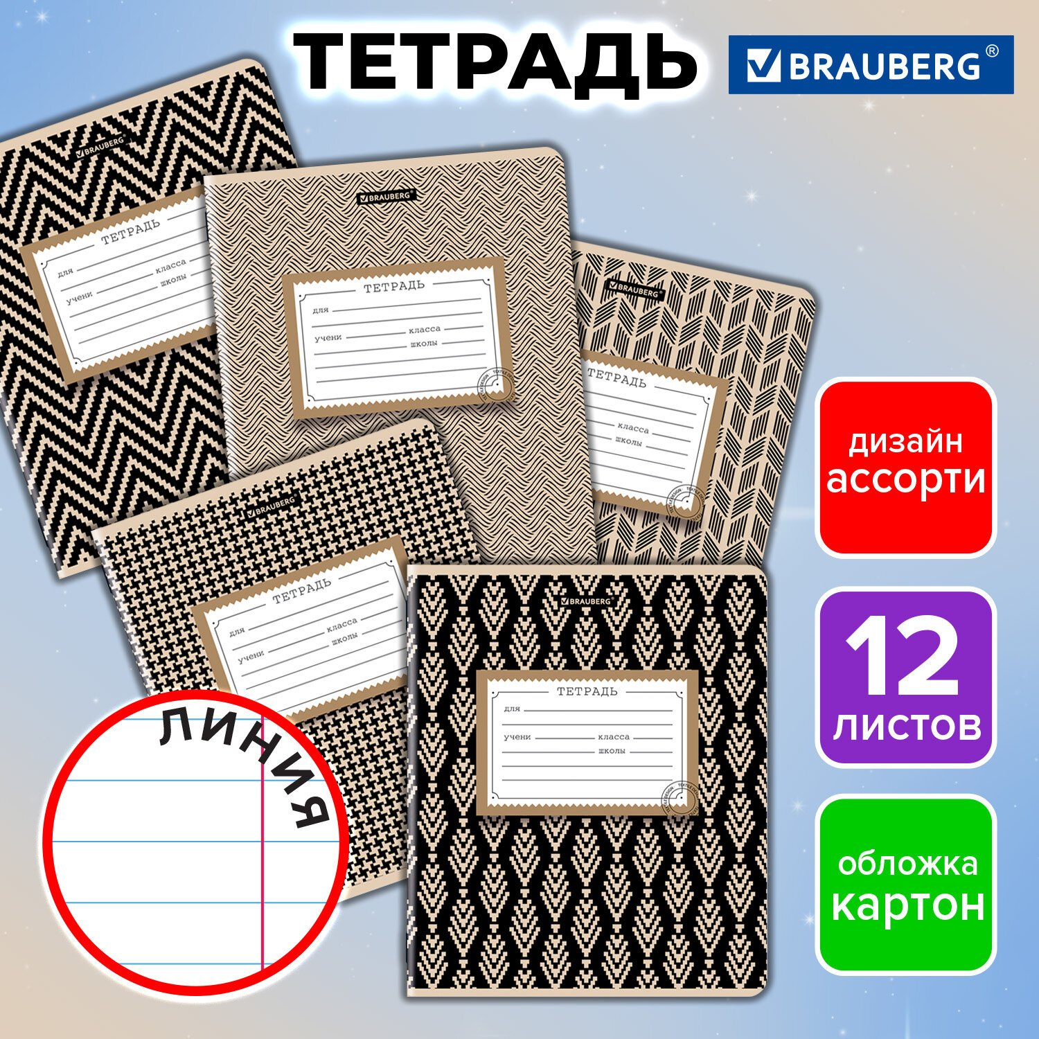 Тетрадь 12 л. BRAUBERG КЛАССИКА, линия, обложка картон, АССОРТИ (5 видов), 103274