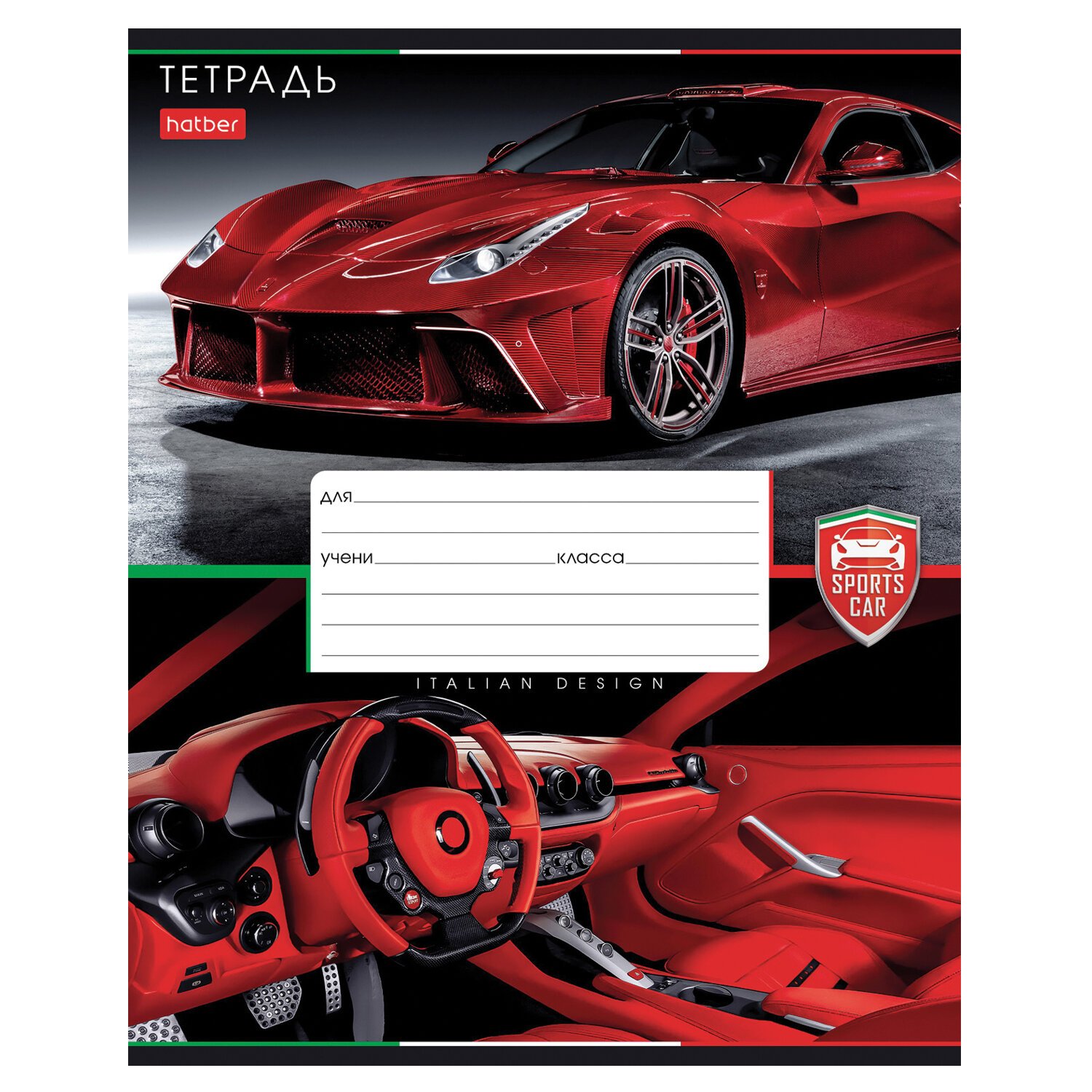 Тетрадь А5 формата 12 листов. Обложка- мелованный картон. Внутренний блок- офсет 60- 65 гр., клетка, красные поля. Скрепление- скоба.