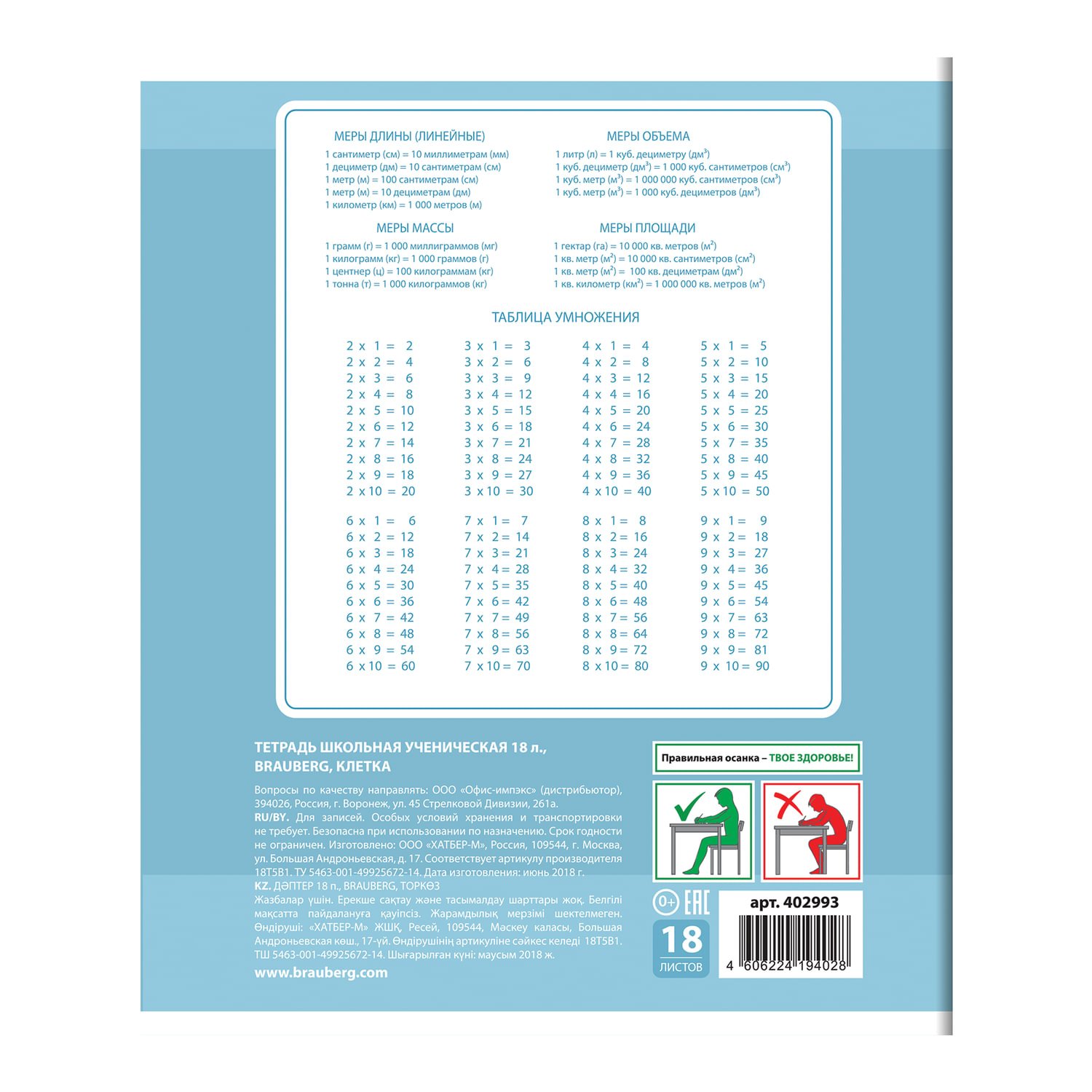 Внутренний блок плотностью 65 г/м2 из офсетной бумаги имеет линовку в клетку с полями. Содержит 18 листов. Обложка изготовлена из импортного мелованного картона. Скрепка надежно скрепляет листы между собой.