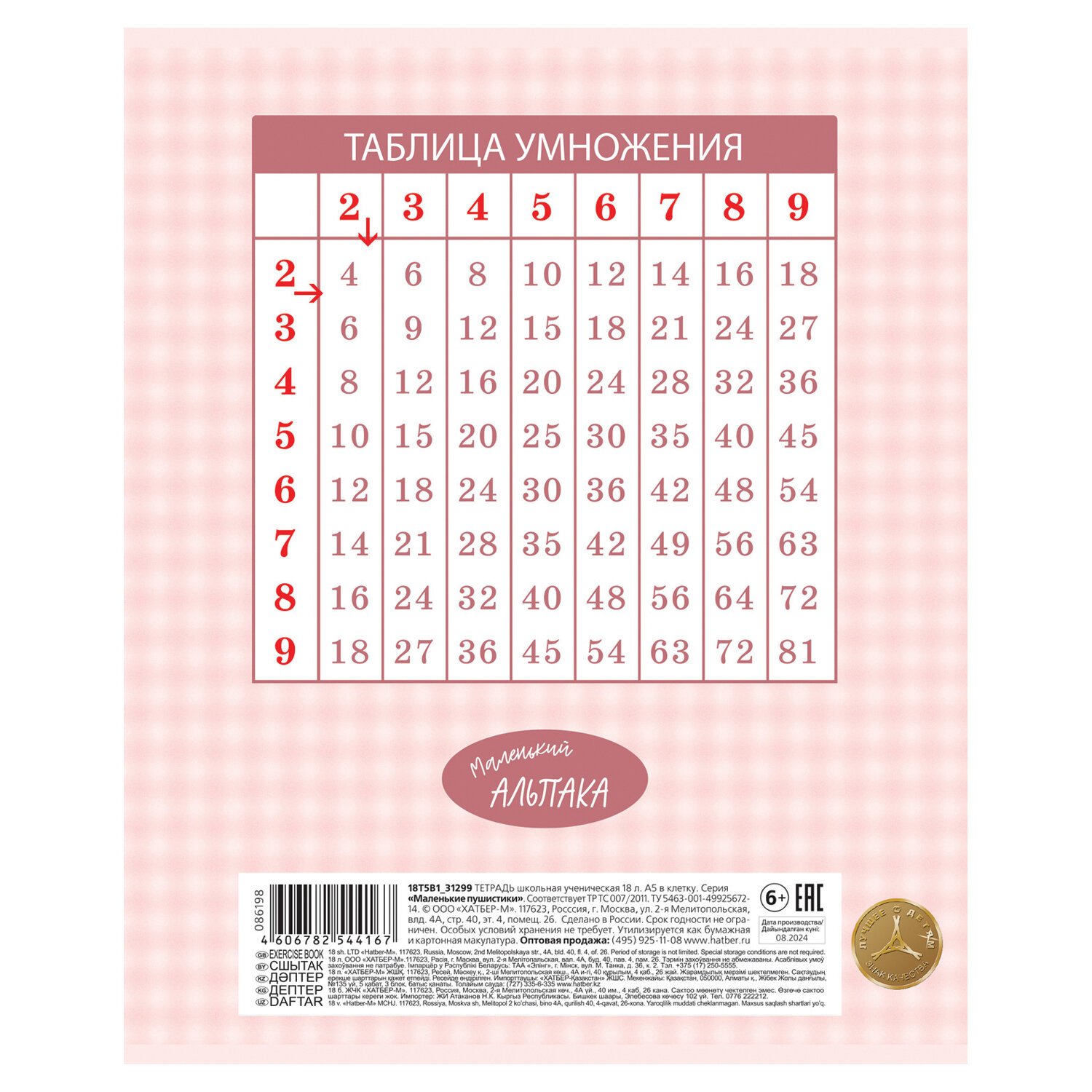 Тетрадь А5 формата 18 листов. Обложка – мелованный картон. Внутренний блок – офсет 60 г/м2, клетка, красные поля. Скрепление – скоба.