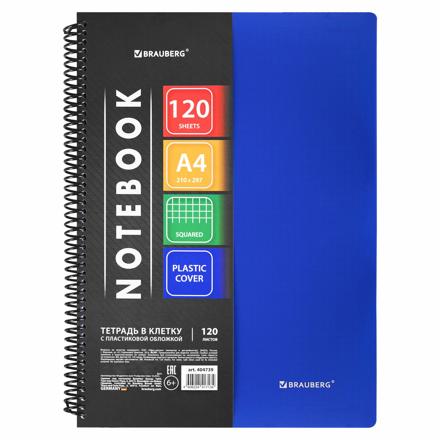 Тетрадь А4 120 л. BRAUBERG "Metropolis", спираль пластиковая, клетка, обложка пластик, СИНИЙ, 404739