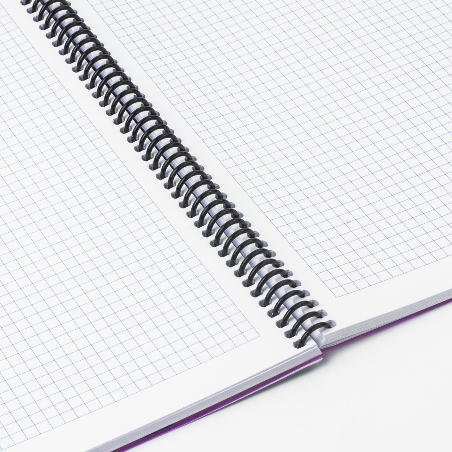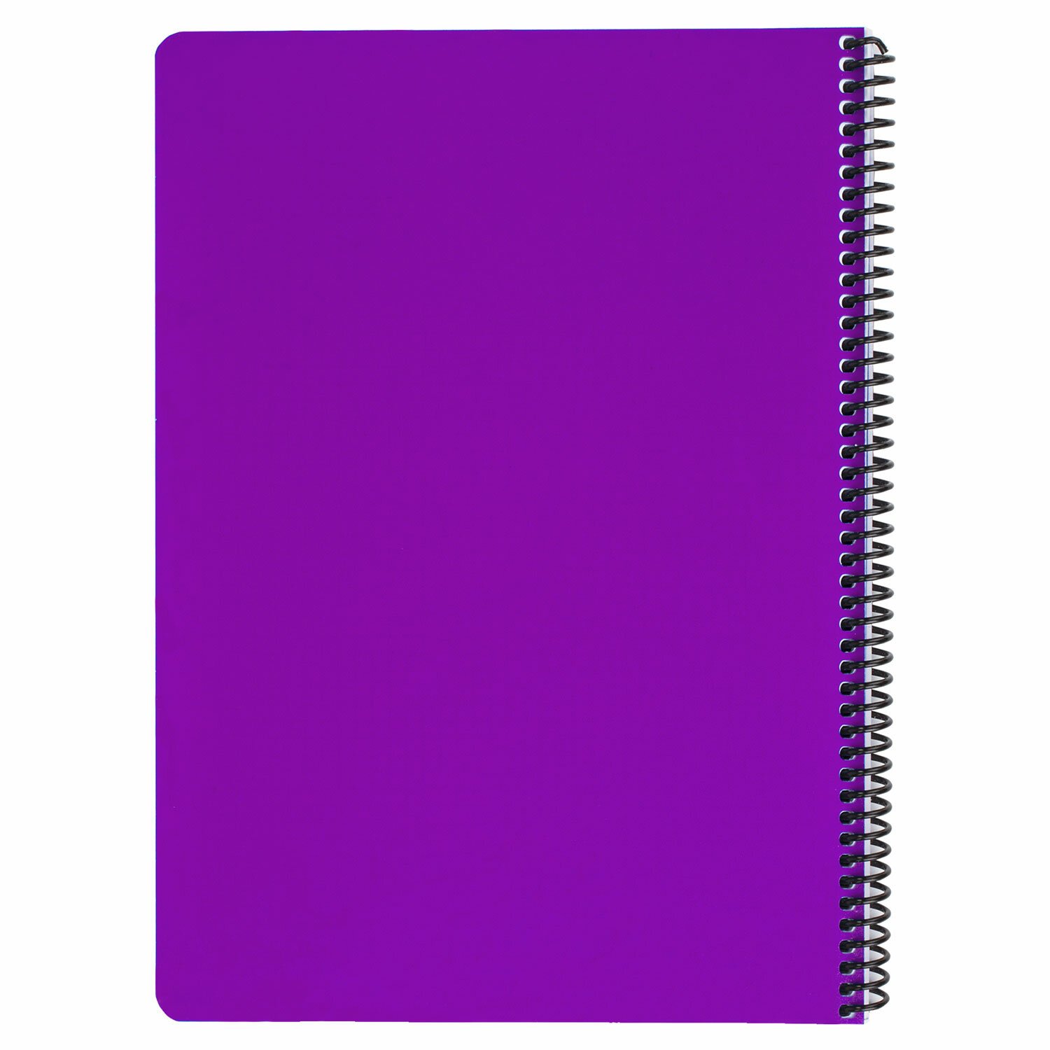 Пластиковая обложка фиолетового цвета надежно защитит внутренний блок от повреждений. Внутренний блок содержит 80 листов офсетной бумаги плотностью 70 г/м2 и белизной 100%. Линовка блока - клетка, с полями. Листы соединены спиралью. Формат А4 (210х297 мм).