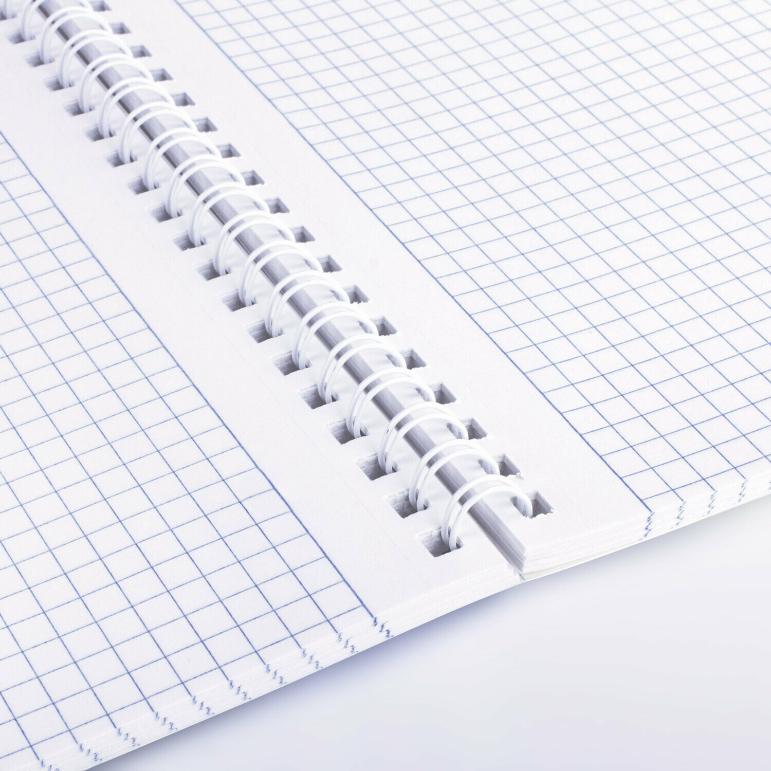 Внутренний блок содержит 96 листов офсетной бумаги плотностью 60 г/м2. Обложка изготовлена из мелованного картона с ламинацией Soft Touch. Линовка – клетка. Гребень надежно скрепляет листы между собой. Белизна – 100%. Формат А4.