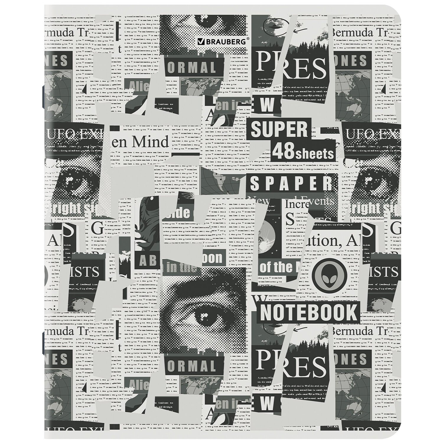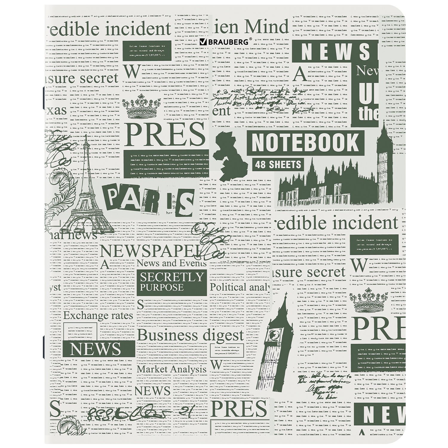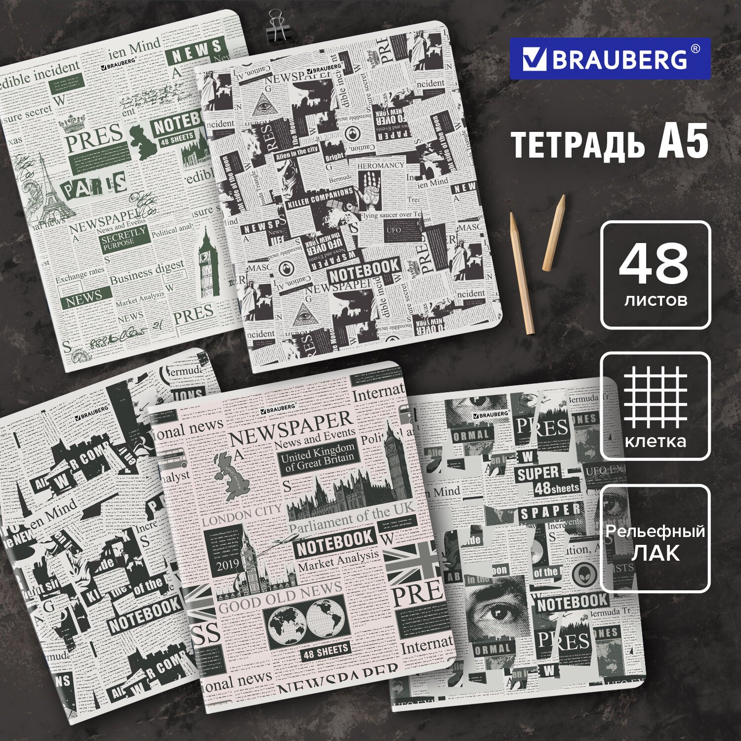 Тетрадь А5, 48 л., BRAUBERG, скоба, клетка, TWIN-лак, "Газета" (микс в спайке), 404356