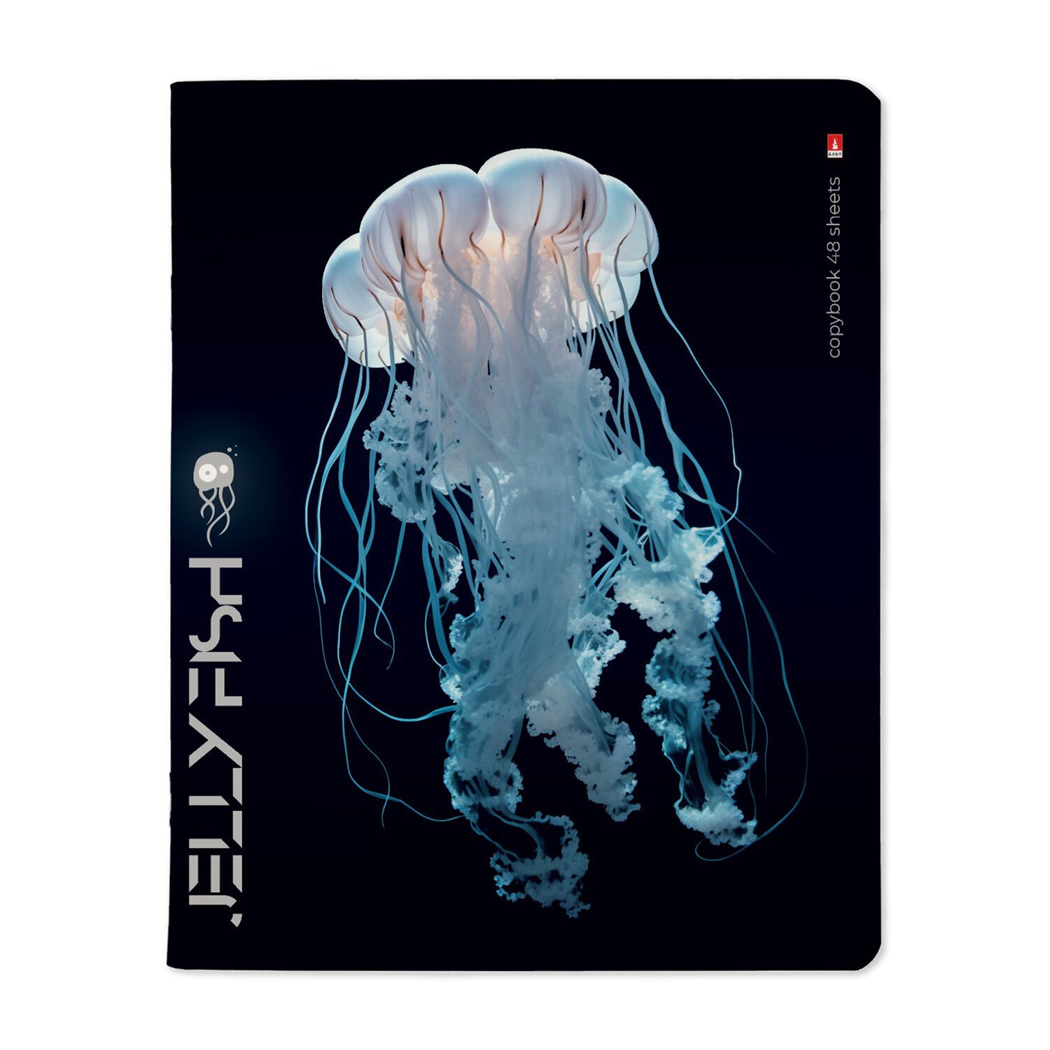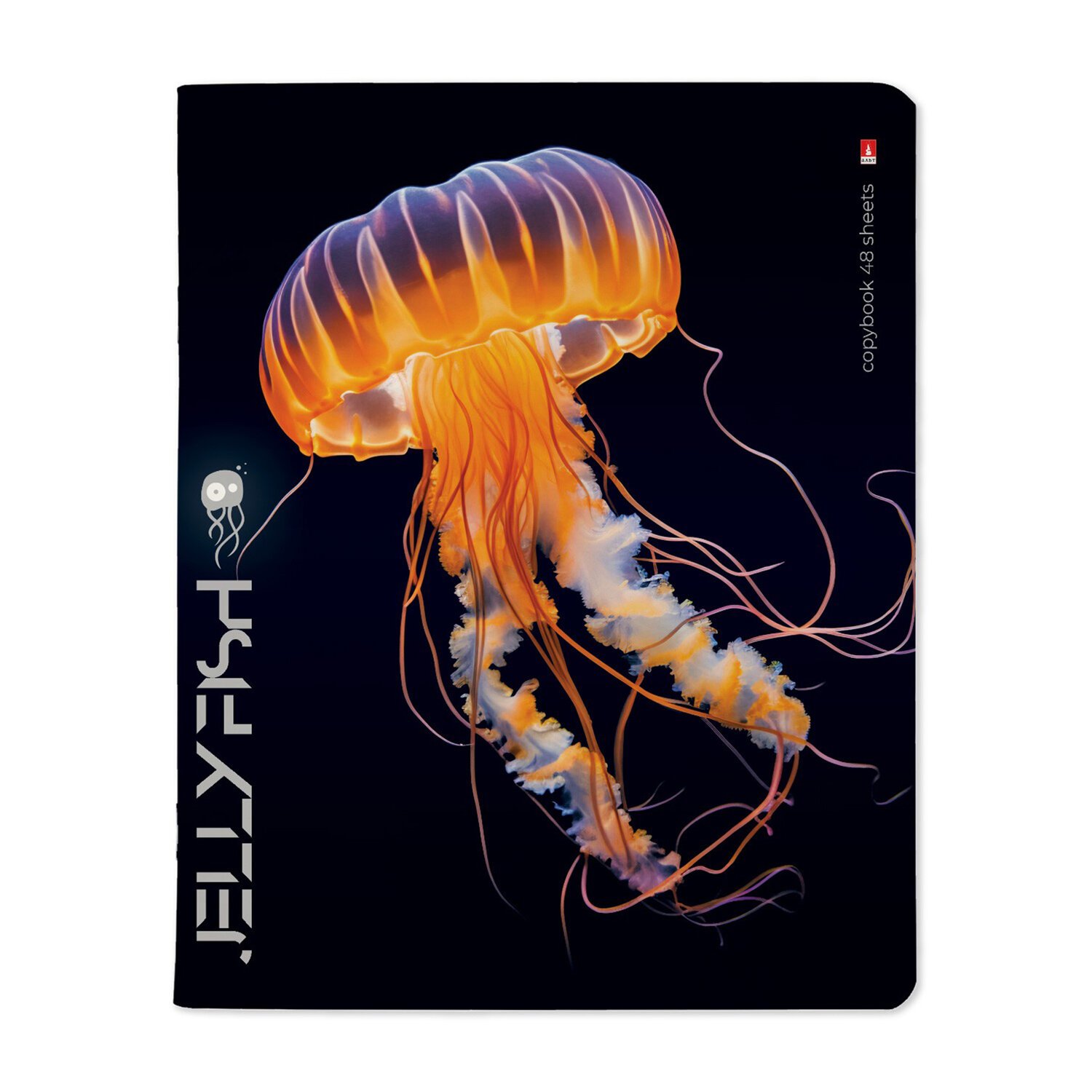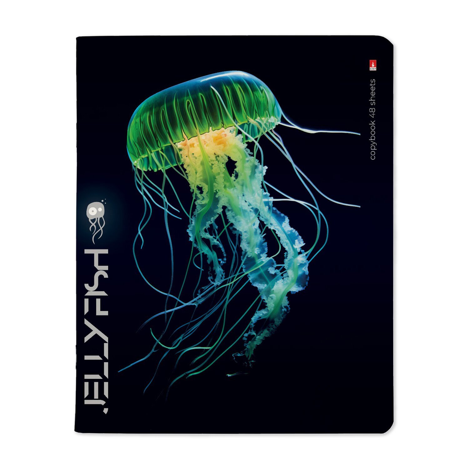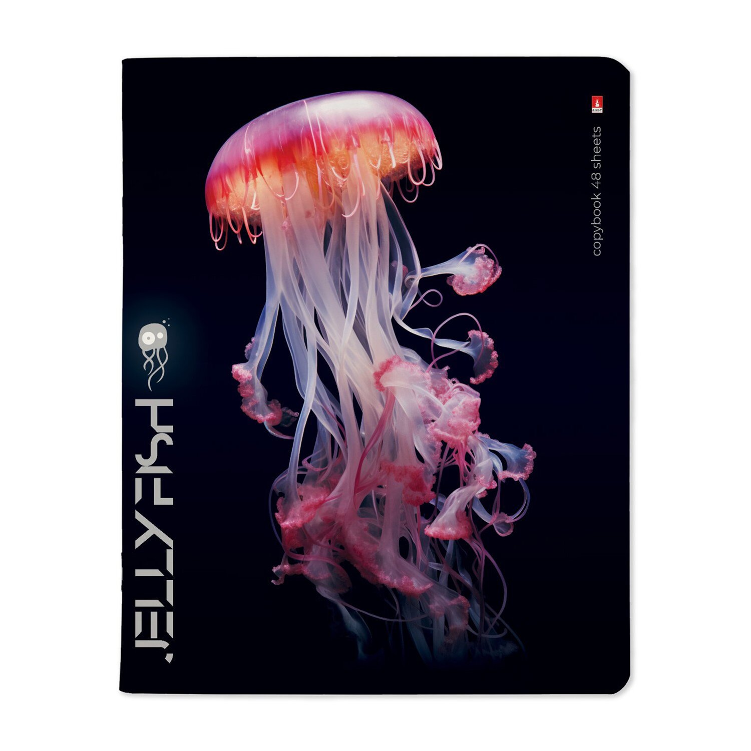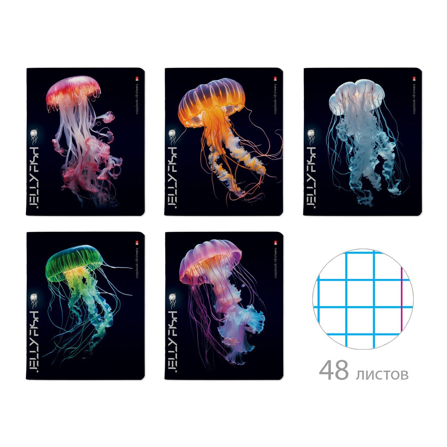 Удобные тетради 48 листов АЛЬТ с яркими медузами на контрастном черном фоне.