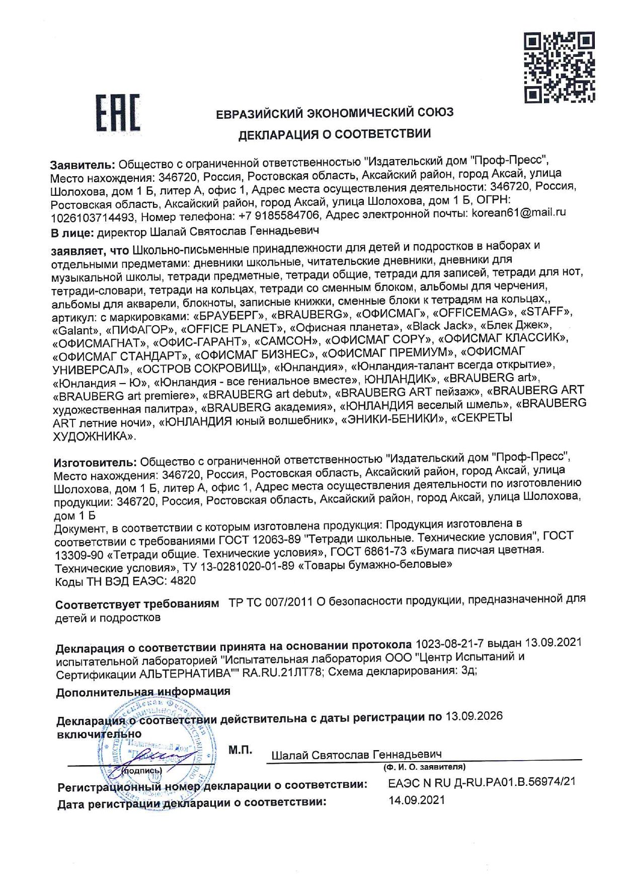 Внутренний блок содержит 96 листов офсетной бумаги плотностью 65 г/м2. Обложка изготовлена из мелованного картона. Линовка - клетка с полями. Скрепка надежно скрепляет листы между собой. Белизна - 100%. Формат А5.