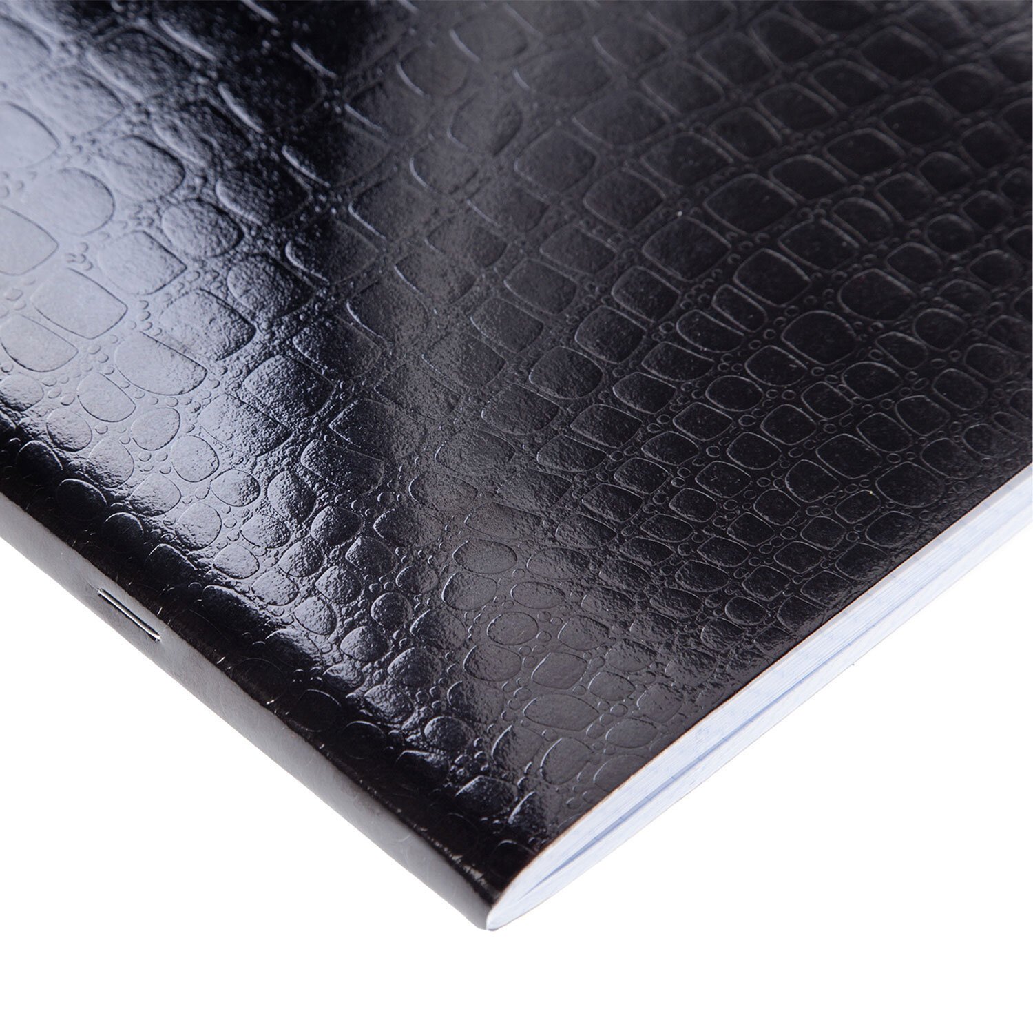 Тетрадь А4 формата 96 листов. Обложка: бумвинил METALLIC Чёрная, дополненная спецэффектами в виде тиснения CROCO. Внутренний блок: офсет 60 гр., клетка. Скрепление: скоба.