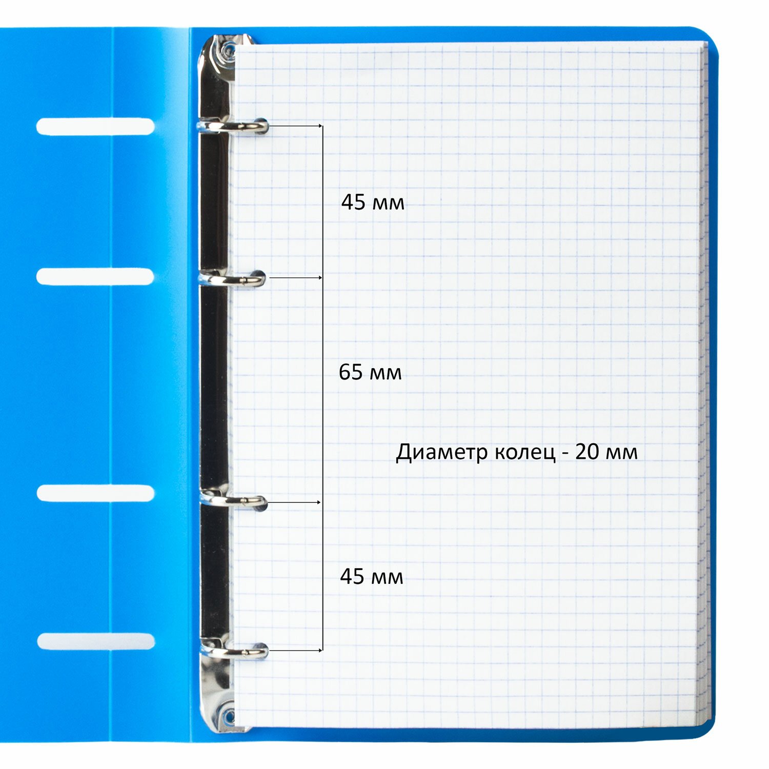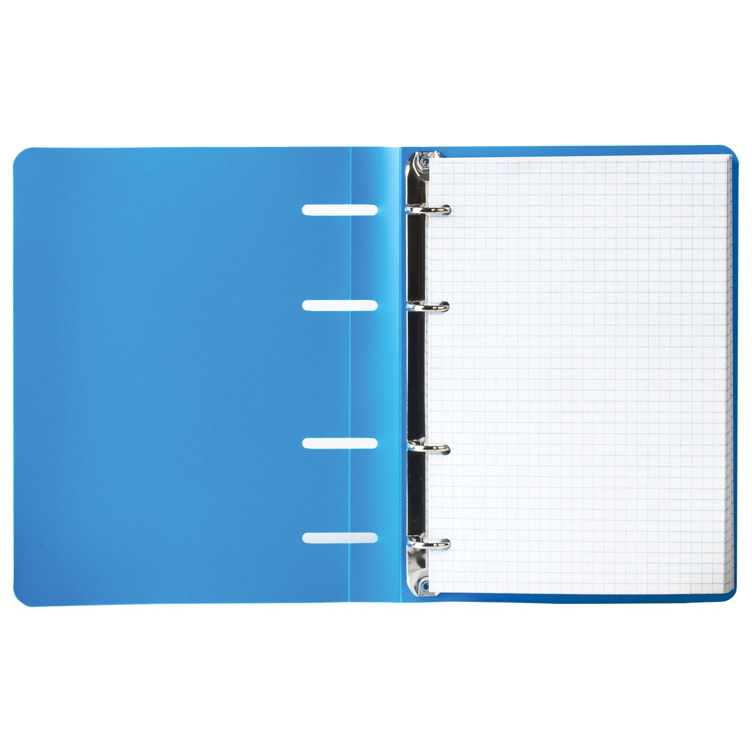 Блок состоит из 80 листов офсетной бумаги белого цвета плотностью 60 г/м2. Линовка - клетка. Обложка с вырубкой под кольца выполнена из износоустойчивого пластика голубого цвета. Формат А5 является стандартным и обеспечивает комфортное ношение в рюкзаке/ранце или папке. Оборудована кольцевым механизмом с 4-мя кольцами для подшивки сменных блоков, что позволит носить на учебу/работу всего одну тетрадь с возможностью добавлять и менять листы.
