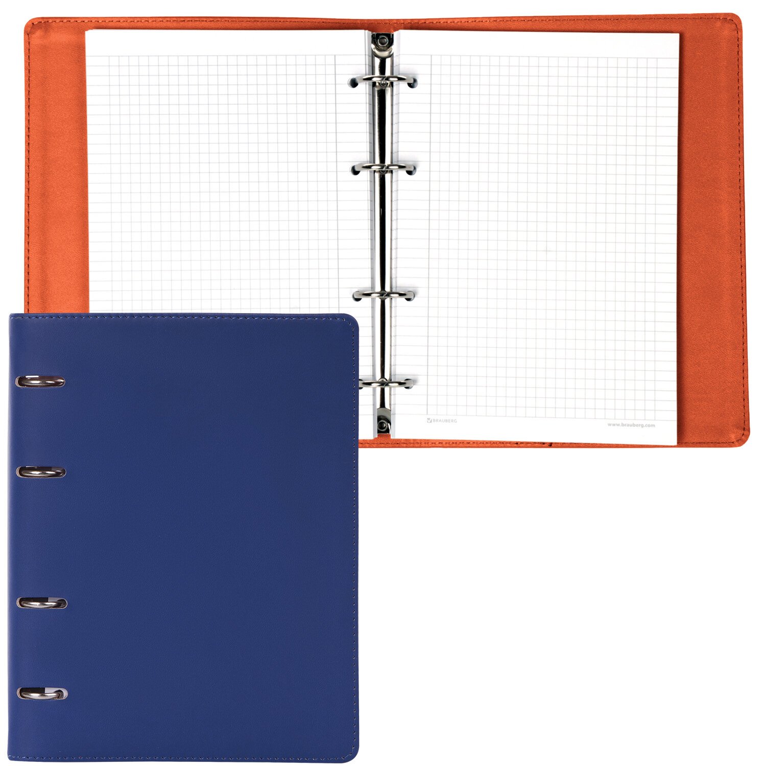 Тетрадь на кольцах А5 (180х220 мм), 120 листов, под кожу, клетка, BRAUBERG "Fusion", синий/оранжевый, 129994