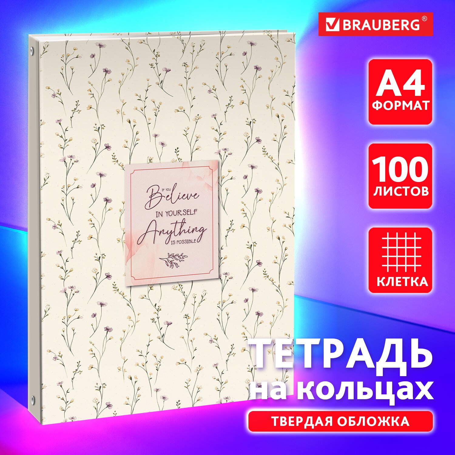 Тетрадь на кольцах БОЛЬШАЯ 210х305мм А4, 100л, обложка картон, клетка, BRAUBERG, Цветы, 405412