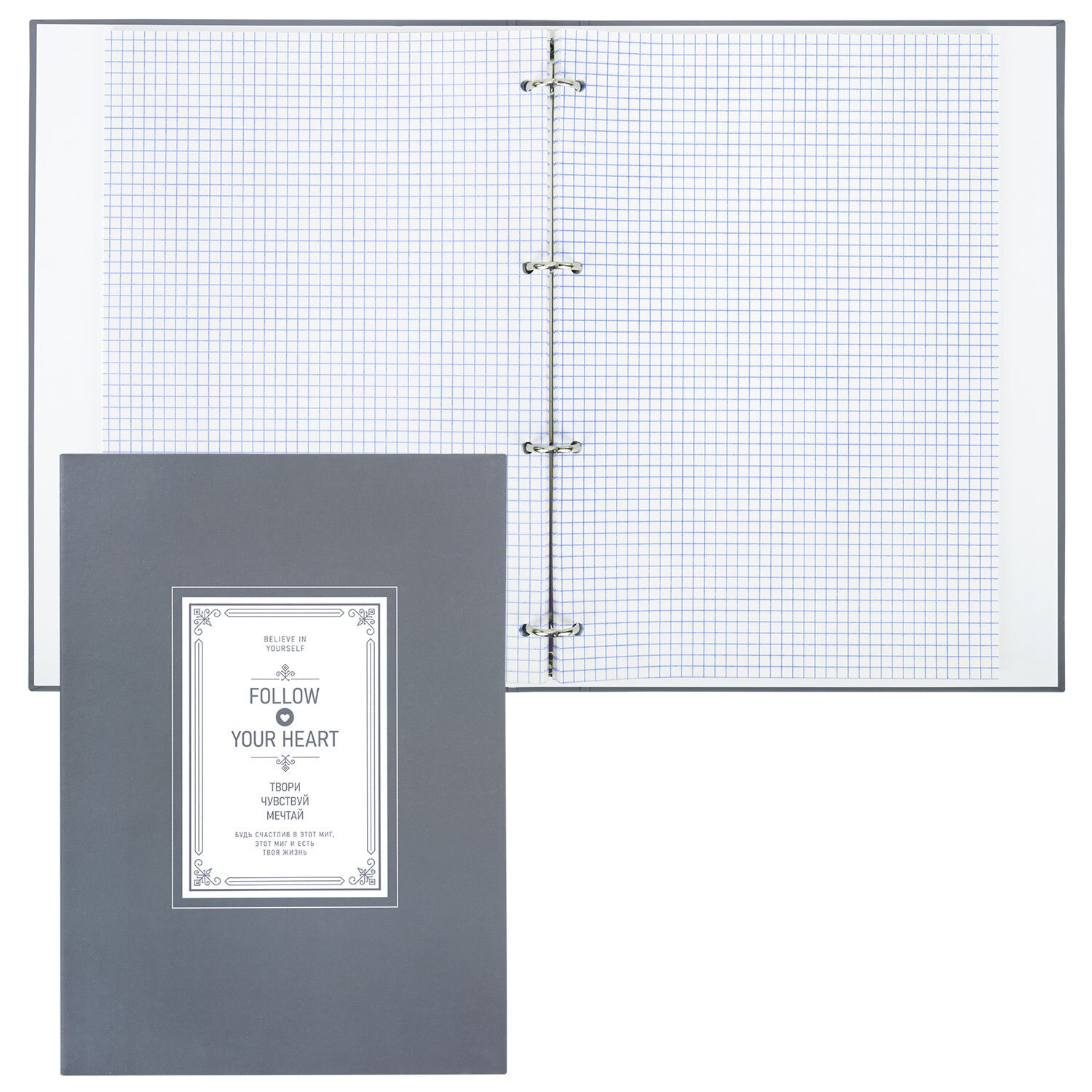 Увеличенный формат А4 предназначен для ведения большего объема записей. Оборудована кольцевым механизмом с 4 кольцами для подшивки сменных блоков, что позволит носить на учебу или работу всего одну тетрадь с возможностью добавлять и менять листы.