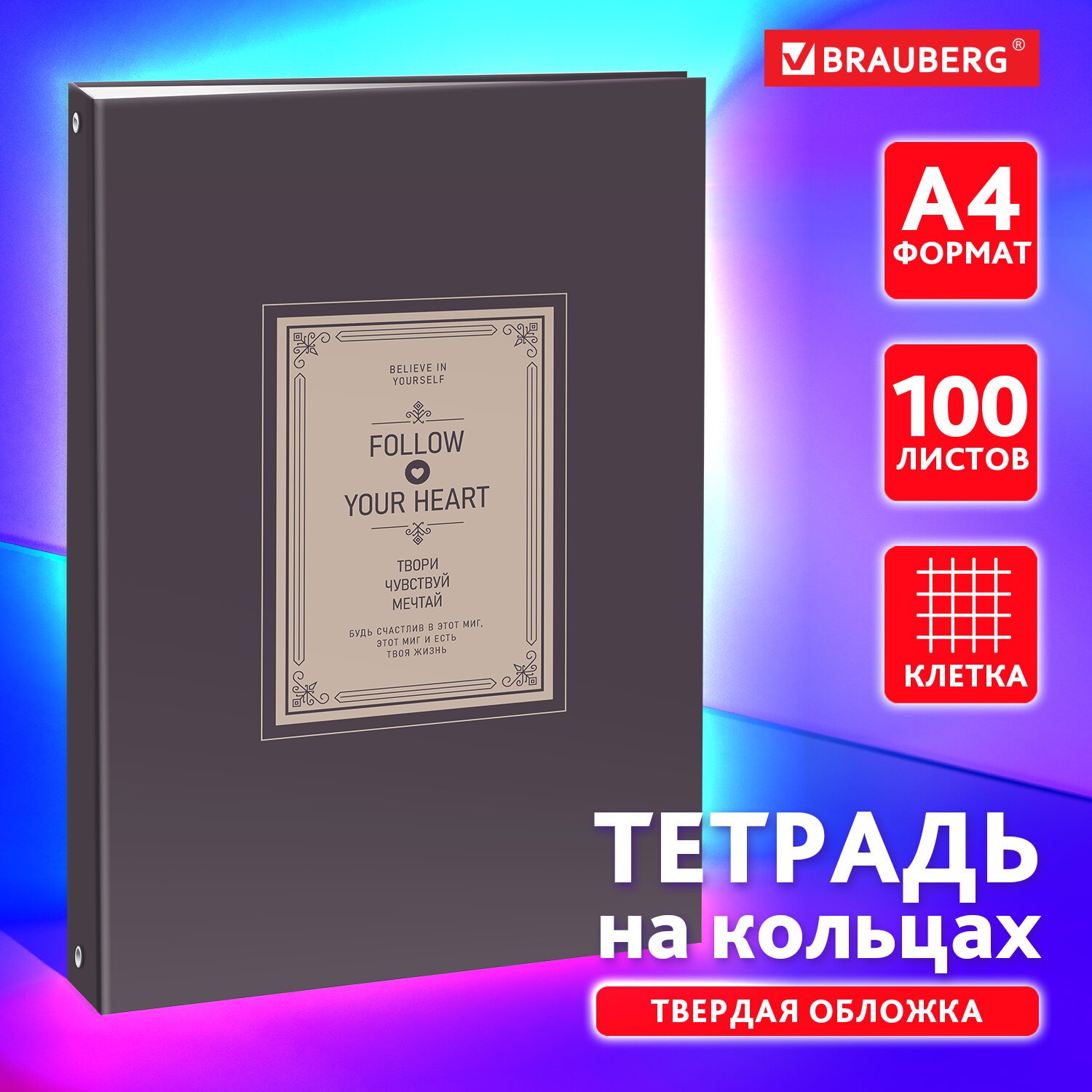 Тетрадь на кольцах БОЛЬШАЯ 210х305мм А4, 100л, обложка картон, клетка, BRAUBERG, Monocolor, 405409