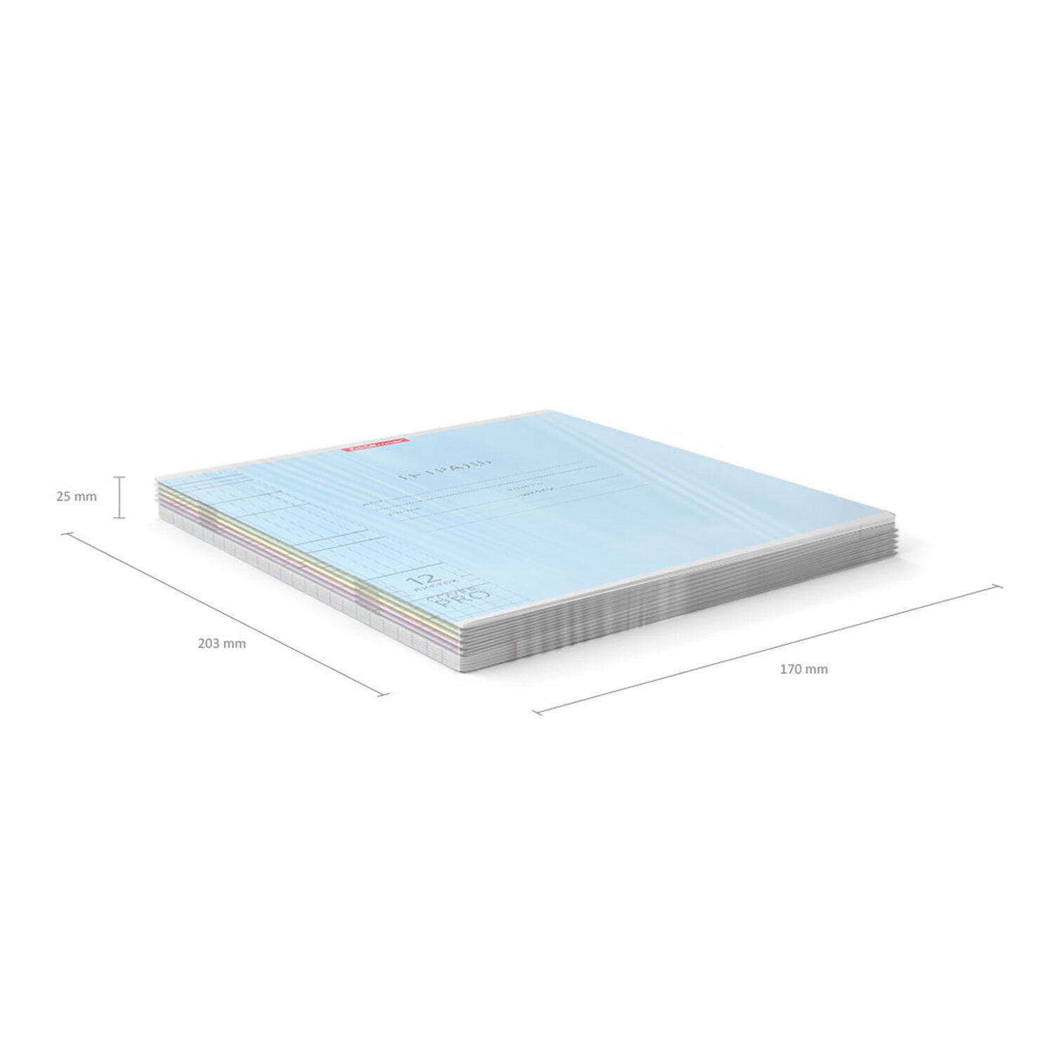 Тетрадь формата А5+ (170x203 мм). Внутренний блок состоит из 12 листов в клетку с полями. Бумага офсетная плотностью 60 г/м2. Цвет линовки – синий. Скругленные уголки обложки и блока. Тип скрепления – скоба.