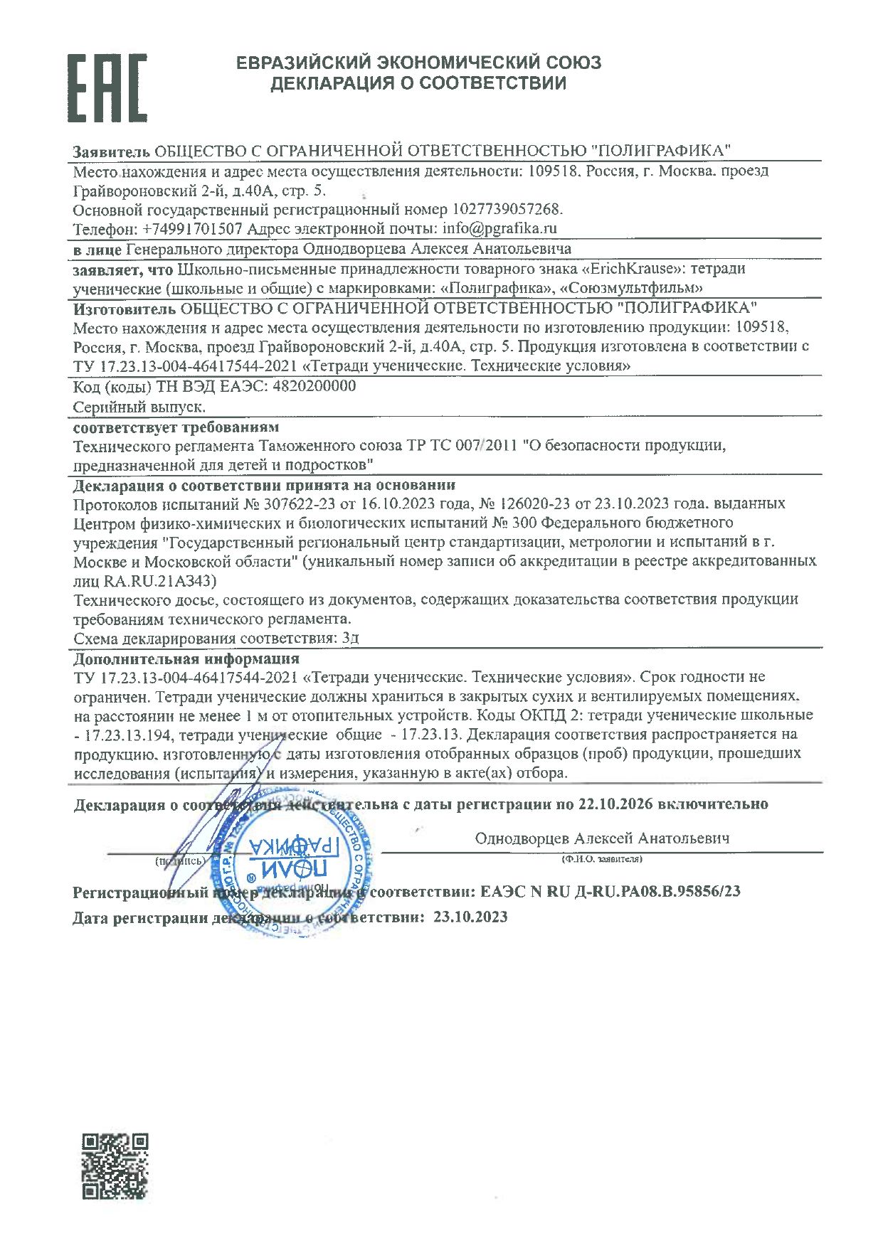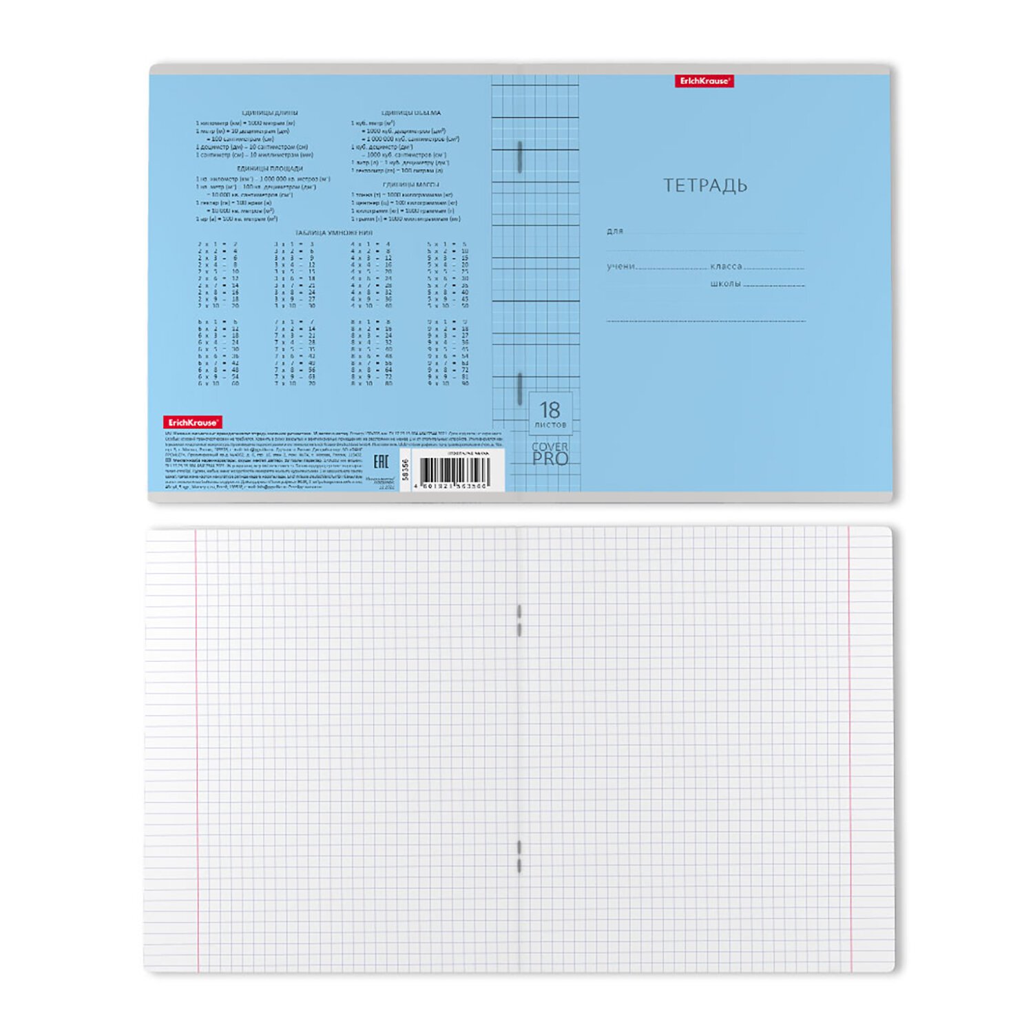 Тетрадь формата А5+ (170x203 мм). Внутренний блок состоит из 18 листов в клетку с полями. Бумага офсетная плотностью 60 г/м2. Цвет линовки – синий. Скругленные уголки обложки и блока. Тип скрепления – скоба.