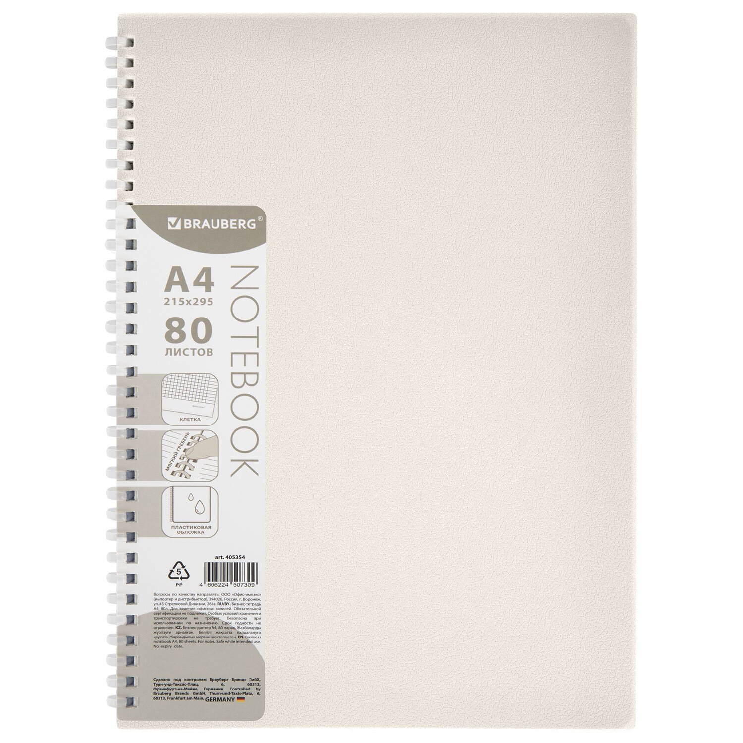 Тетрадь обложка пластик, А4 80л. гребень мягкий (силиконовый), клетка, BRAUBERG, бежевая, 405354