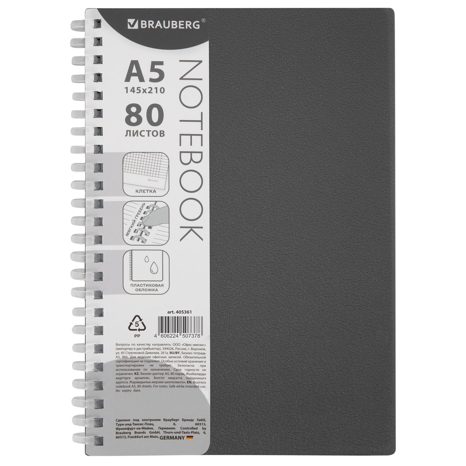 Тетрадь обложка пластик, А5 80л. гребень мягкий, вырубка для ручки, клетка, BRAUBERG, черный, 405376