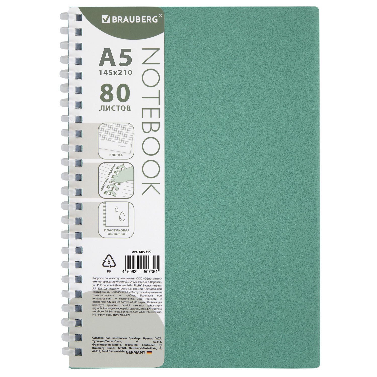 Тетрадь обложка пластик, А5 80л. гребень мягкий (силиконовый), клетка, BRAUBERG, зеленая, 405359