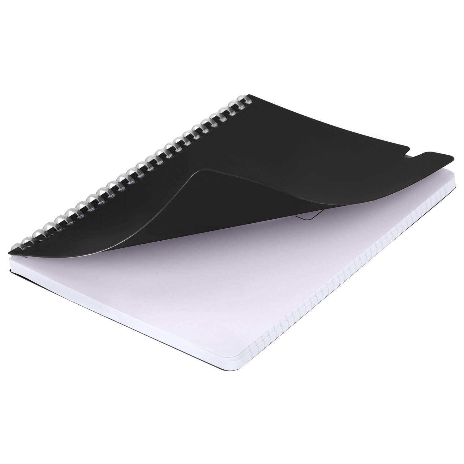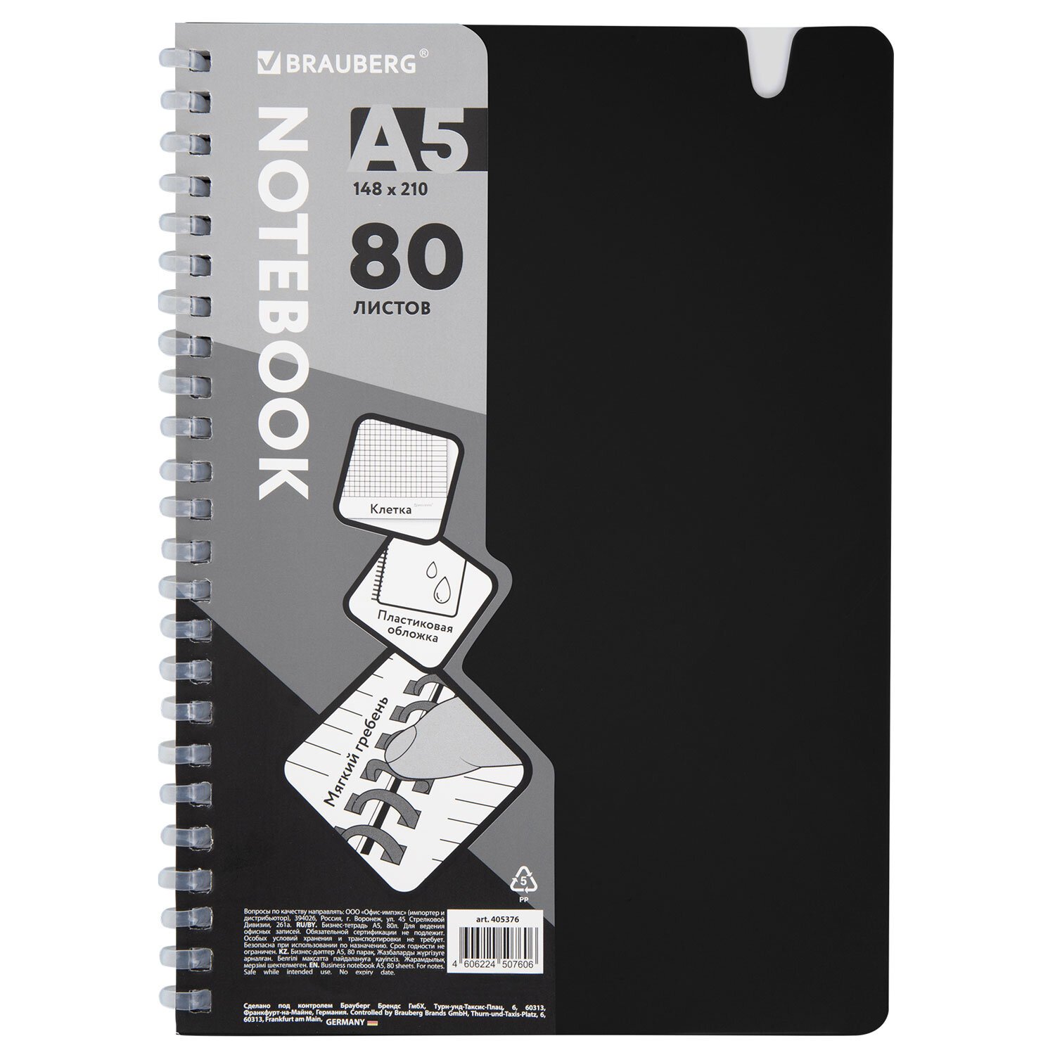 Тетрадь обложка пластик, А5 80л. гребень мягкий, вырубка для ручки, клетка, BRAUBERG, черный, 405376
