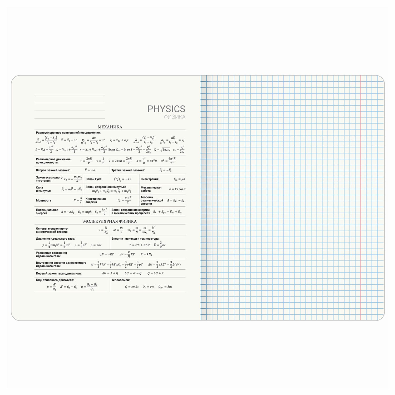 Тетрадь по физике формата А5 (165х202 мм) содержит 48 листов, изготовленных из высококачественной офсетной бумаги плотностью 60 г/м2 и белизной 100%. Листы соединены скобами. Линовка блока - в клетку, поля красные. Обложка выполнена из мелованного картона плотностью 190 г/м2. Благодаря глянцевому лаку краски на изображении становятся более яркими и насыщенными. В справочном материале собраны основные подсказки по школьному предмету для учащихся.