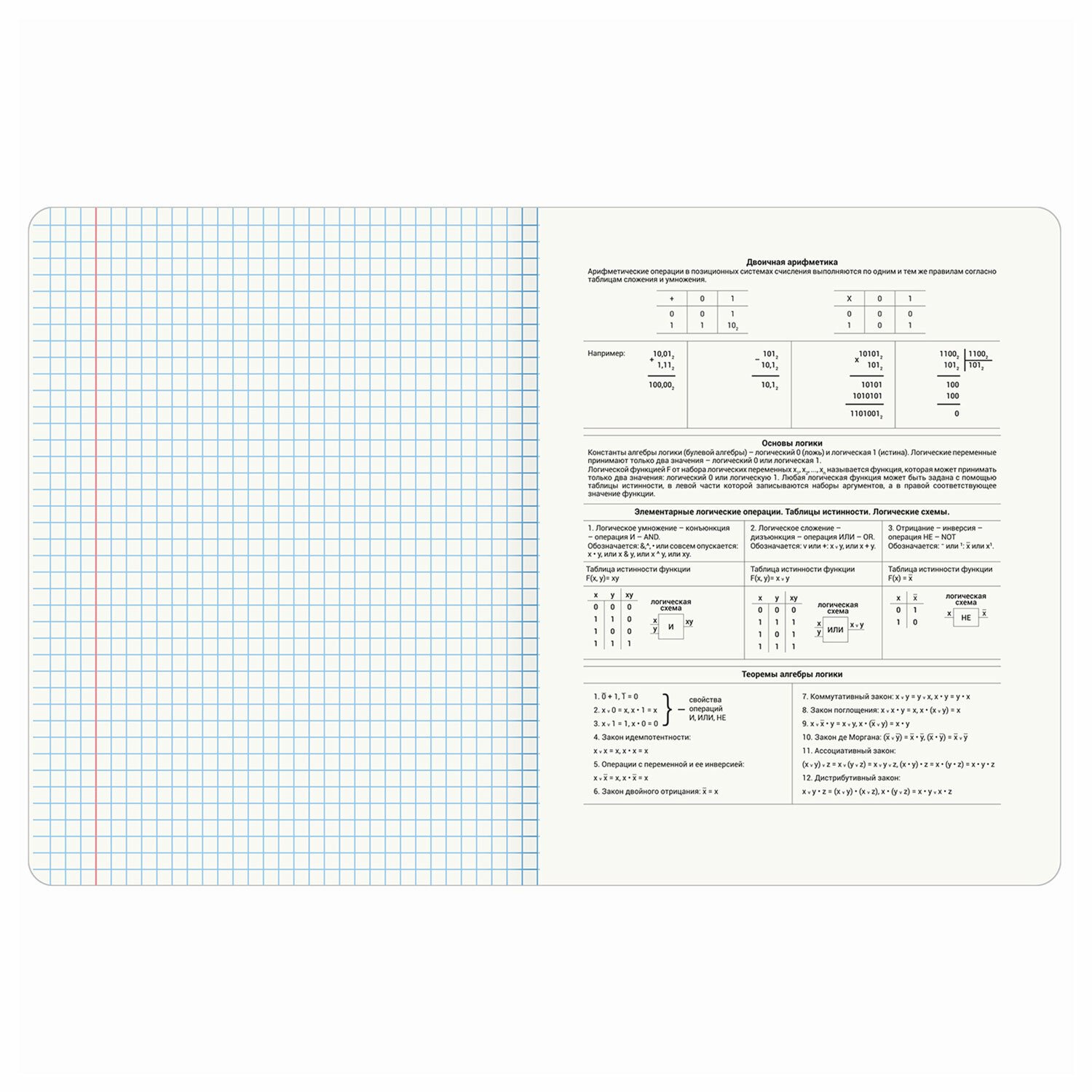 Тетрадь по информатике формата А5 (165х202 мм) содержит 48 листов, изготовленных из высококачественной офсетной бумаги 100% белизны, плотностью 60 г/м2. Листы соединены скобами. Линовка блока - в клетку, красные поля.