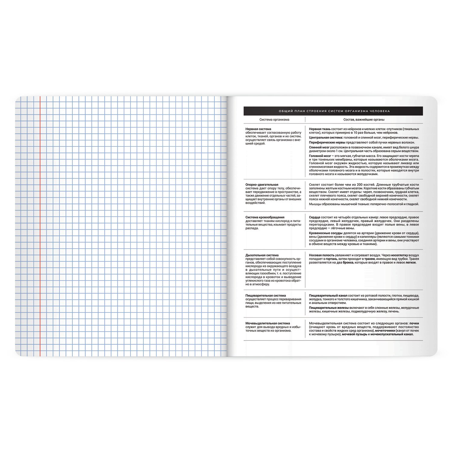 Тетрадь по биологии формата А5 с двойной обложкой: внешняя выполнена из высококачественного износостойкого черного пластика, внутренняя – из качественной офсетной бумаги. Преимущество таких тетрадей заключается в том, что для сохранения внешнего вида не нужно покупать дополнительную обложку. На подкладных листах содержится справочный материал по предмету. Внутренний блок плотностью 60 г/м2 из офсетной бумаги содержит 48 листов в клетку с полями. Белизна блока - 100%. Скрепка надежно соединяет листы между собой.