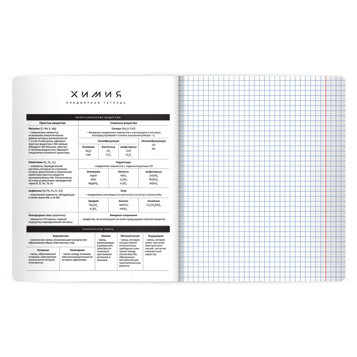 Тетрадь по химии формата А5 с двойной обложкой: внешняя выполнена из высококачественного износостойкого черного пластика, внутренняя – из качественной офсетной бумаги. Преимущество таких тетрадей заключается в том, что для сохранения внешнего вида не нужно покупать дополнительную обложку. На подкладных листах содержится справочный материал по предмету. Внутренний блок плотностью 60 г/м2 из офсетной бумаги содержит 48 листов в клетку с полями. Белизна блока - 100%. Скрепка надежно соединяет листы между собой.