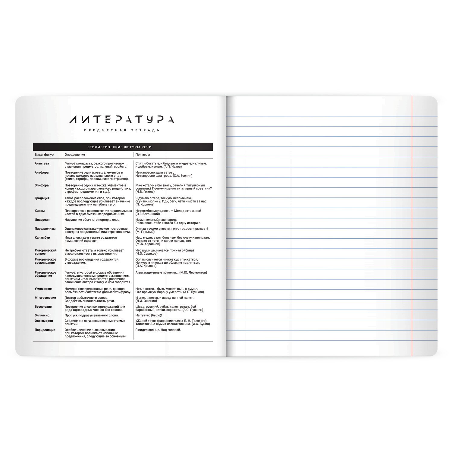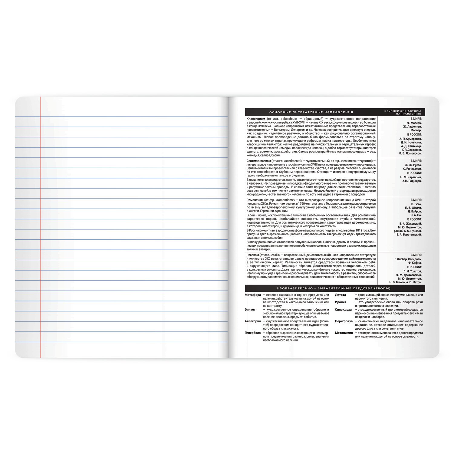 Тетрадь по литературе формата А5 с двойной обложкой: внешняя выполнена из высококачественного износостойкого черного пластика, внутренняя – из качественной офсетной бумаги. Преимущество таких тетрадей заключается в том, что для сохранения внешнего вида не нужно покупать дополнительную обложку. На подкладных листах содержится справочный материал по предмету. Внутренний блок плотностью 60 г/м2 из офсетной бумаги содержит 48 листов в линию с полями. Белизна блока - 100%. Скрепка надежно соединяет листы между собой.