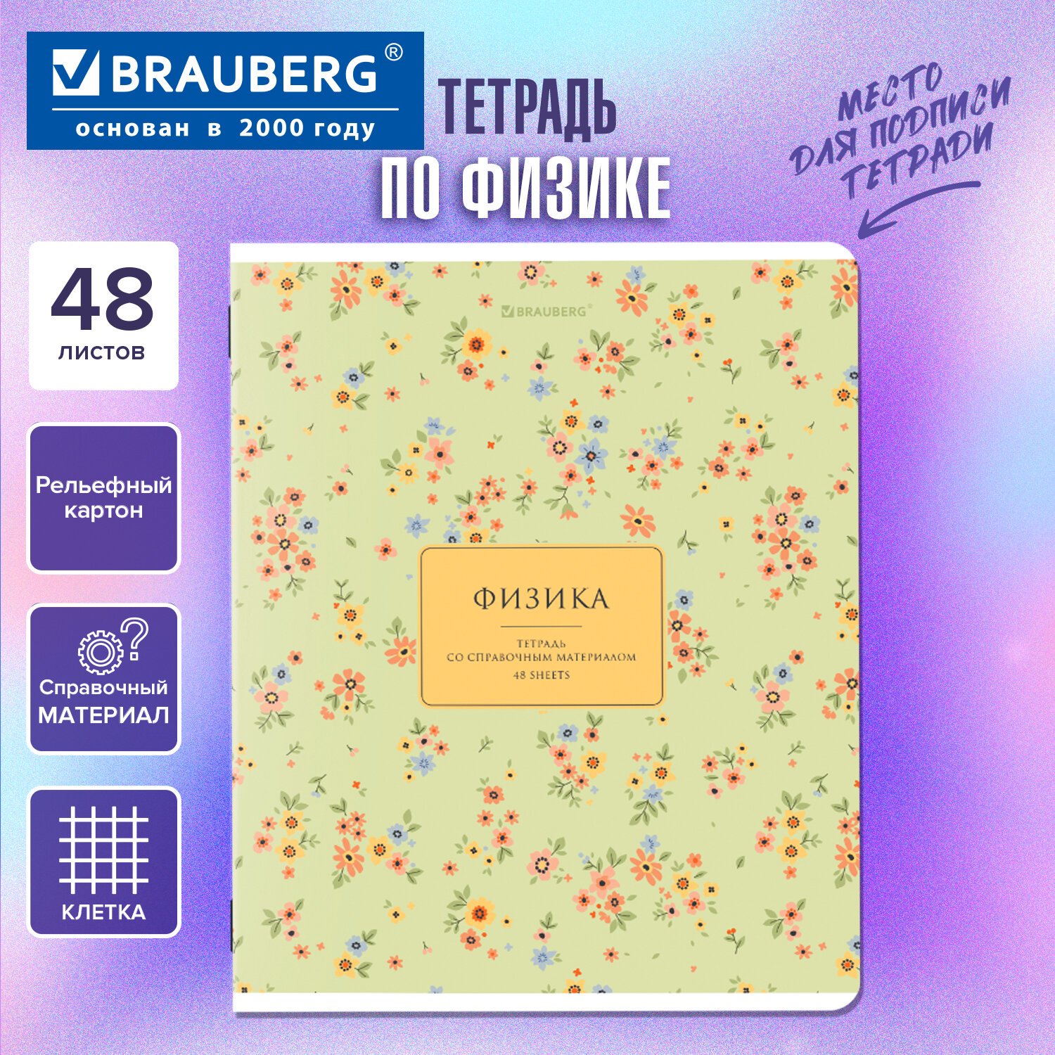 Тетрадь предметная BLOSSOM 48л, рельефный картон, ФИЗИКА, клетка, подсказ, BRAUBERG, 405600