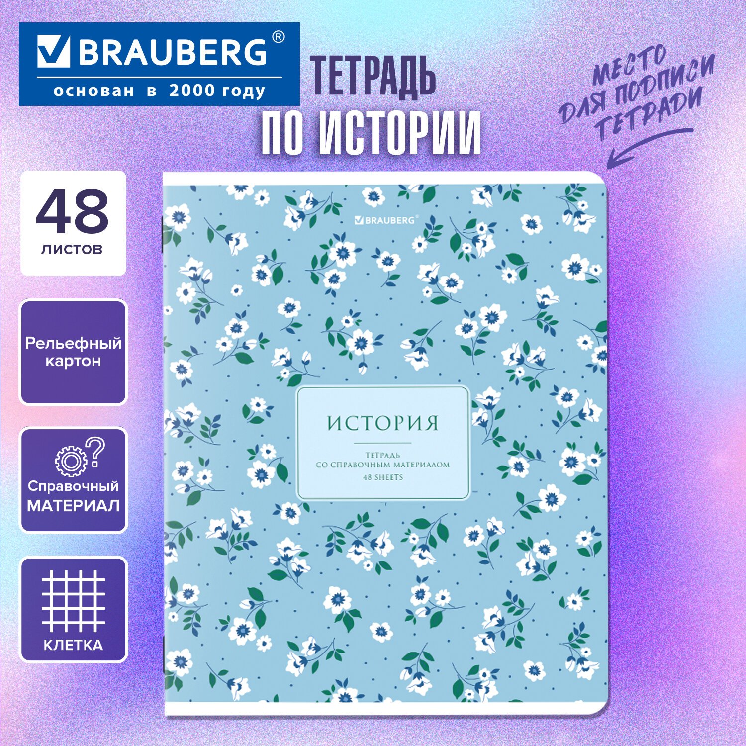 Тетрадь предметная BLOSSOM 48л, рельефный картон, ИСТОРИЯ, клетка, подсказ, BRAUBERG, 405597