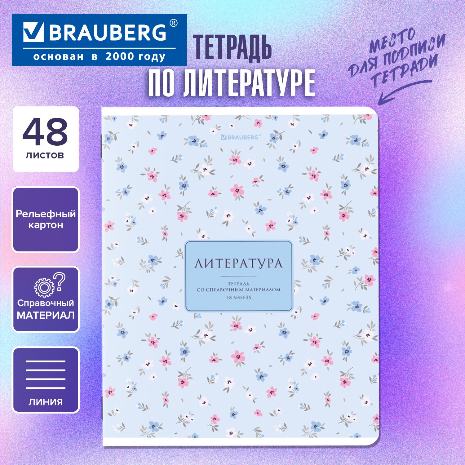 Тетрадь предметная BLOSSOM 48л, рельефный картон, ЛИТЕРАТУРА, линия, подсказ,BRAUBERG, 405598