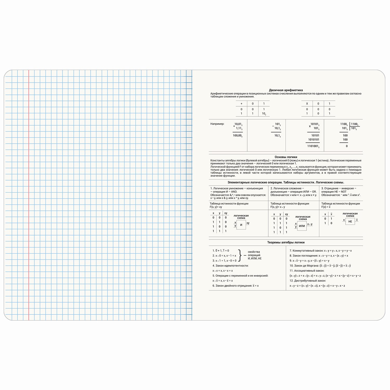 Тетрадь по информатике формата А5 (165х205 мм) содержит 48 листов, изготовленных из высококачественной офсетной бумаги плотностью 60 г/м2 и белизной 100%. Листы соединены скобами. Линовка блока – в клетку, красные поля. Обложка выполнена из мелованного картона плотностью 190 г/м2 в тематике соответствующего предмета. Спецэффект "выборочный TWIN-лак" придает изображениям оригинальность и выразительность. В справочном материале для учащихся собраны основные подсказки по школьному предмету.