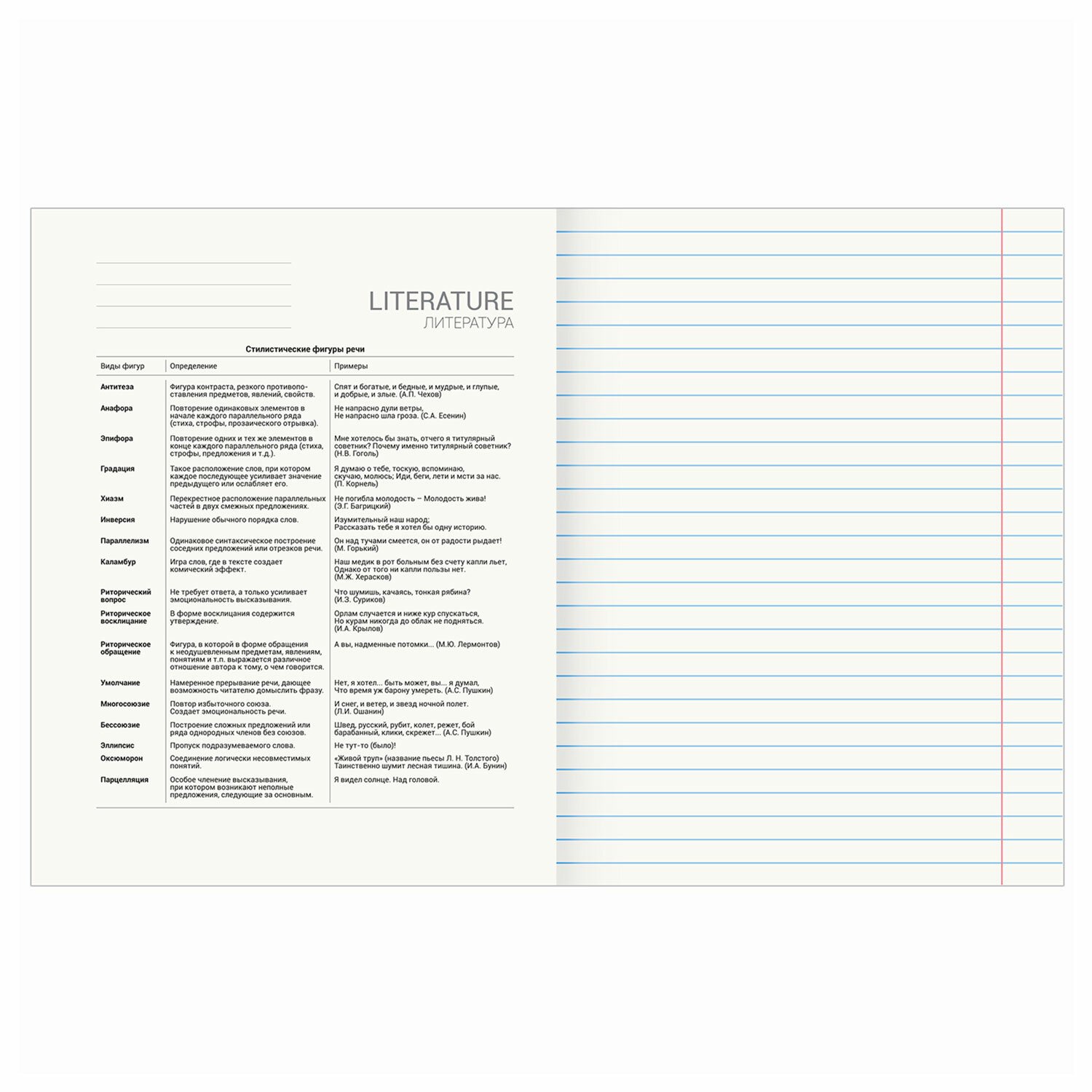 Тетрадь по литературе формата А5 (165х202 мм) содержит 48 листов, изготовленных из высококачественной офсетной бумаги плотностью 60 г/м2 и белизной 100%.