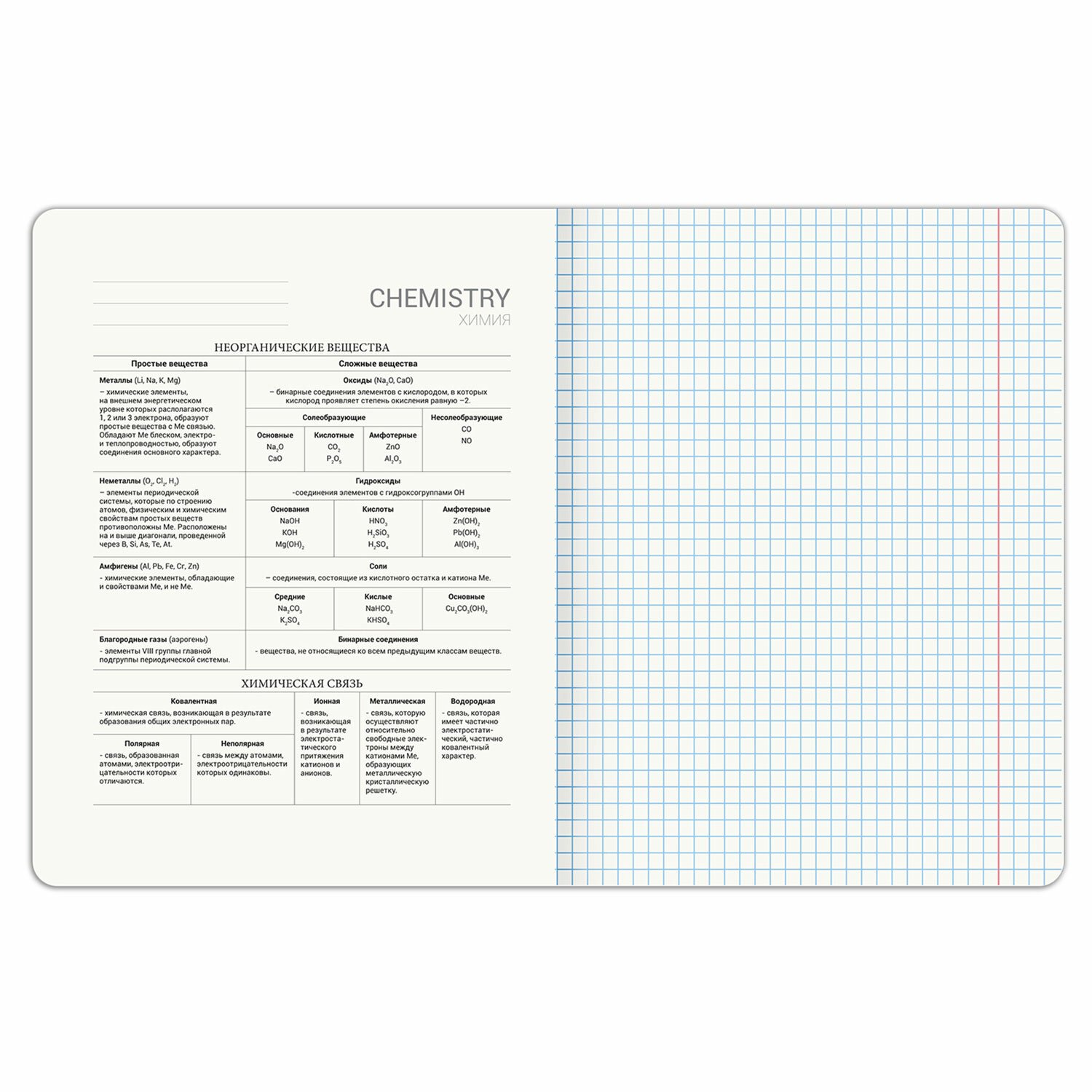 Тетрадь 48 листов, формат А5 (165х202 мм). Изготовлена из высококачественной офсетной бумаги плотностью 60 г/м2, белизной 100%. Листы соединены скобами. Линовка блока - в клетку, поля красные.