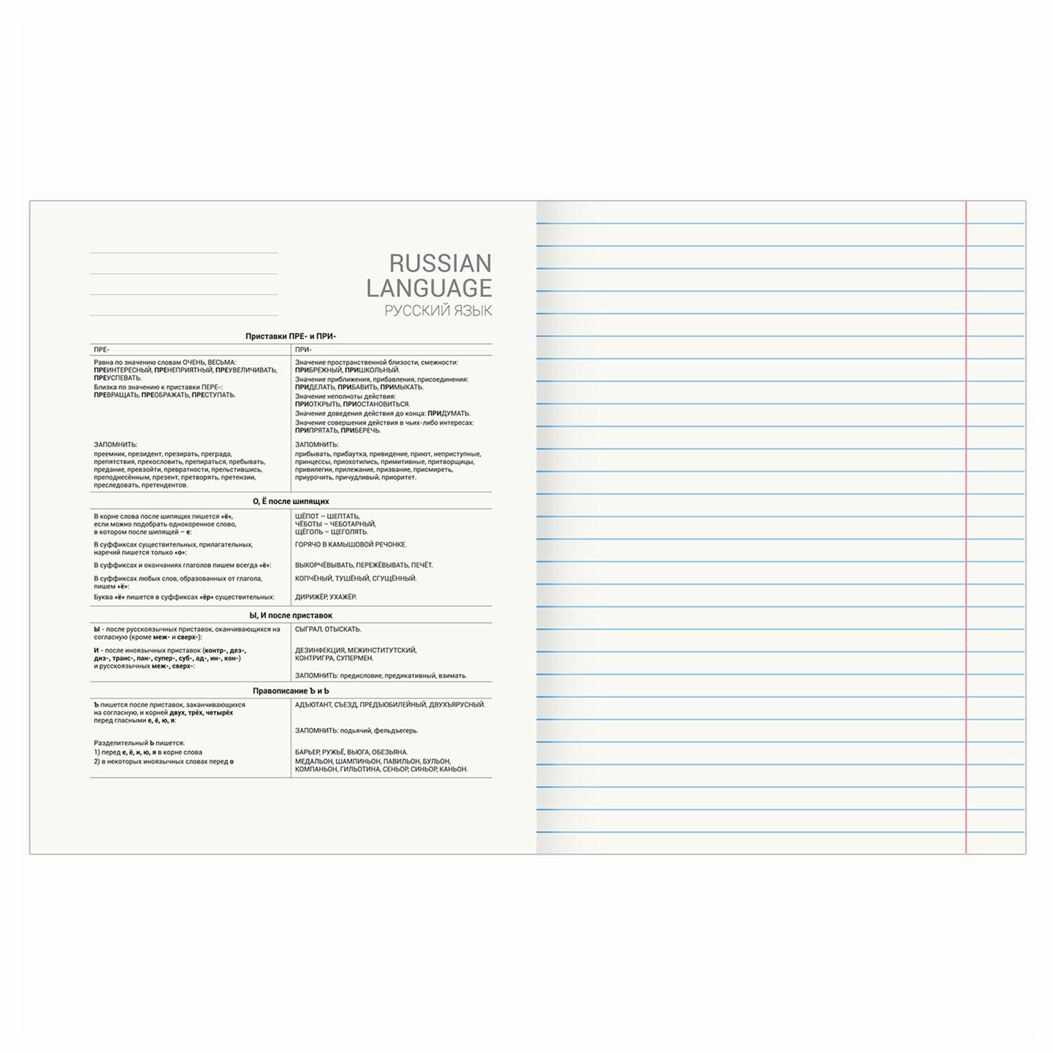 Листы соединены скобами. Линовка блока - линия, красные поля. Обложка выполнена из мелованного картона плотностью 190 г/м2. В справочном материале для учащихся собраны основные подсказки по школьному предмету.
