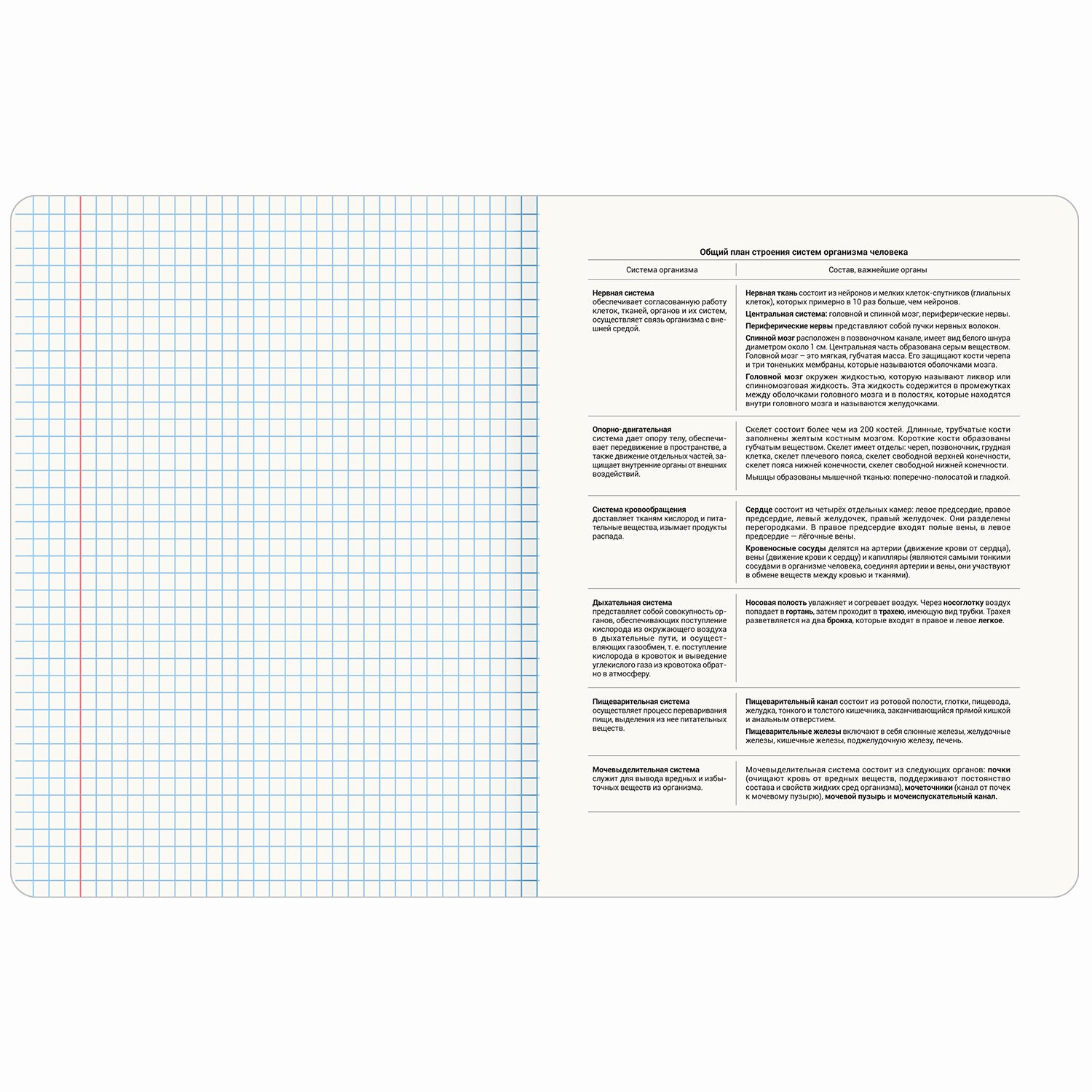 Тетрадь 48 листов, формат А5 (165х202 мм). Изготовлена из высококачественной офсетной бумаги плотностью 60 г/м2 и белизной 100%. Листы скреплены скобами. Блок линован в клетку, с красными полями. Обложка выполнена из мелованного картона плотностью 190 г/м2. Справочный материал для учащихся содержит ключевые сведения по школьному предмету.