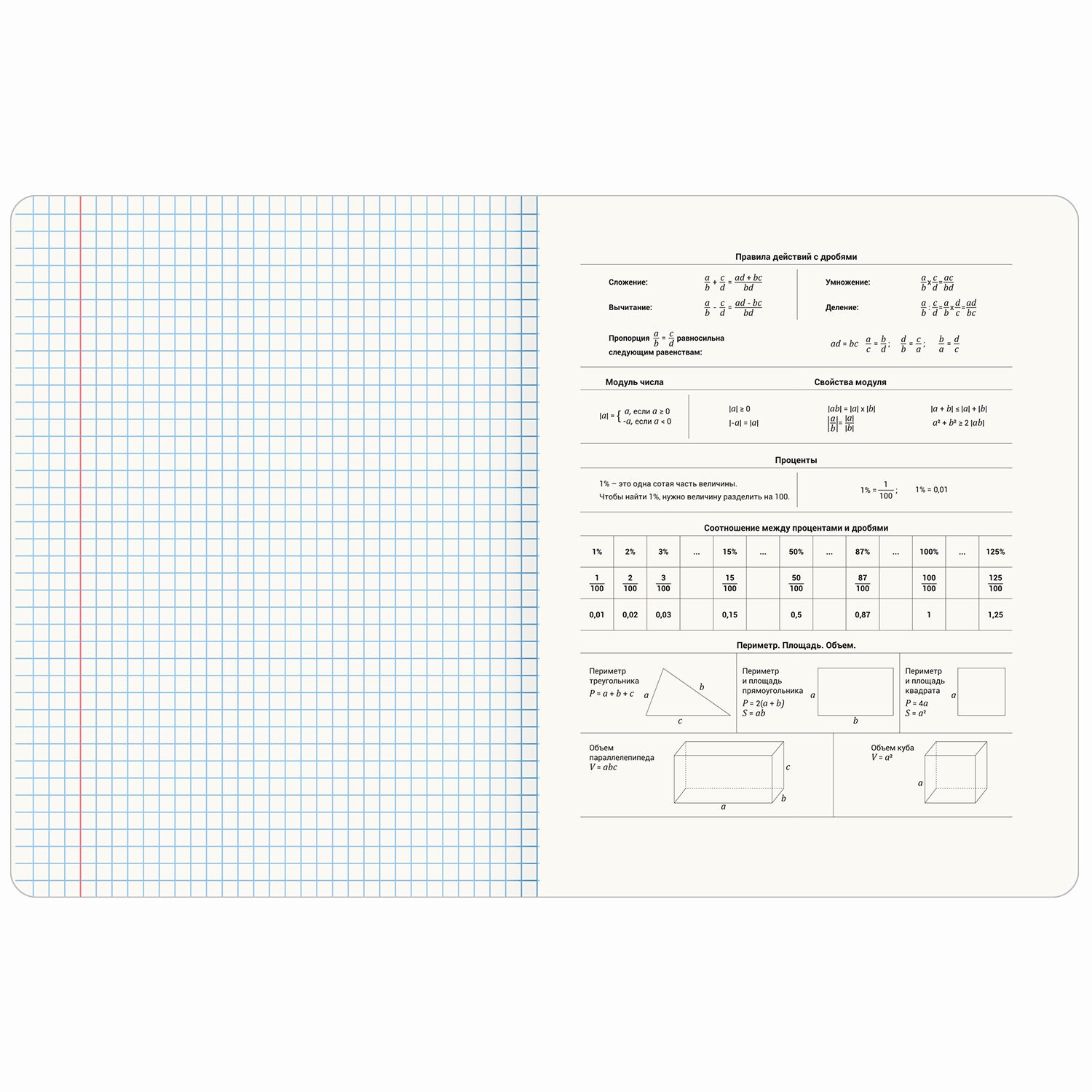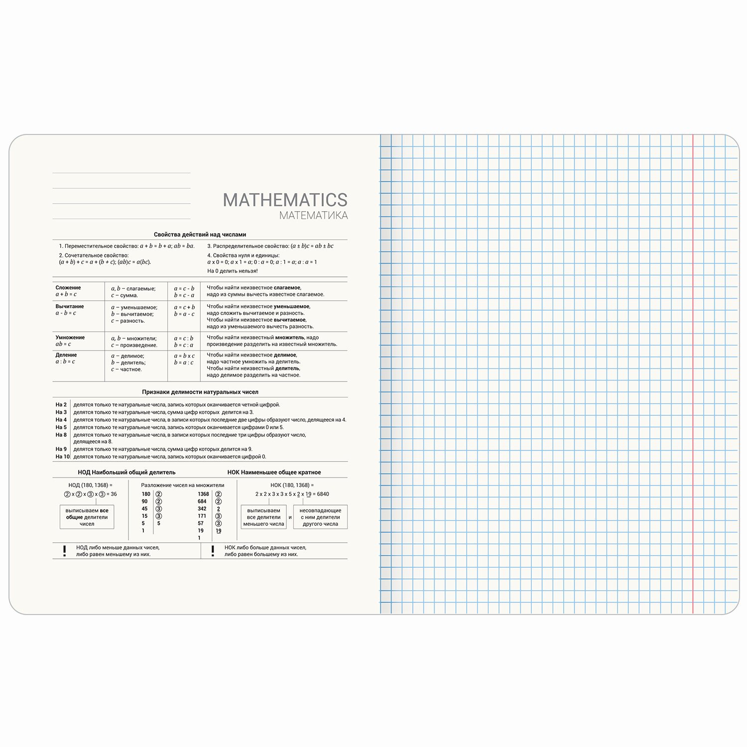 Тетрадь по математике 48 листов, формат А5 (165х202 мм). Изготовлена из высококачественной офсетной бумаги 100% белизны плотностью 60 г/м2. Листы соединены скобами. Линовка блока – в клетку, поля красные. Обложка выполнена из мелованного картона плотностью 190 г/м2. В справочном материале собраны основные подсказки по школьному предмету для учащихся.