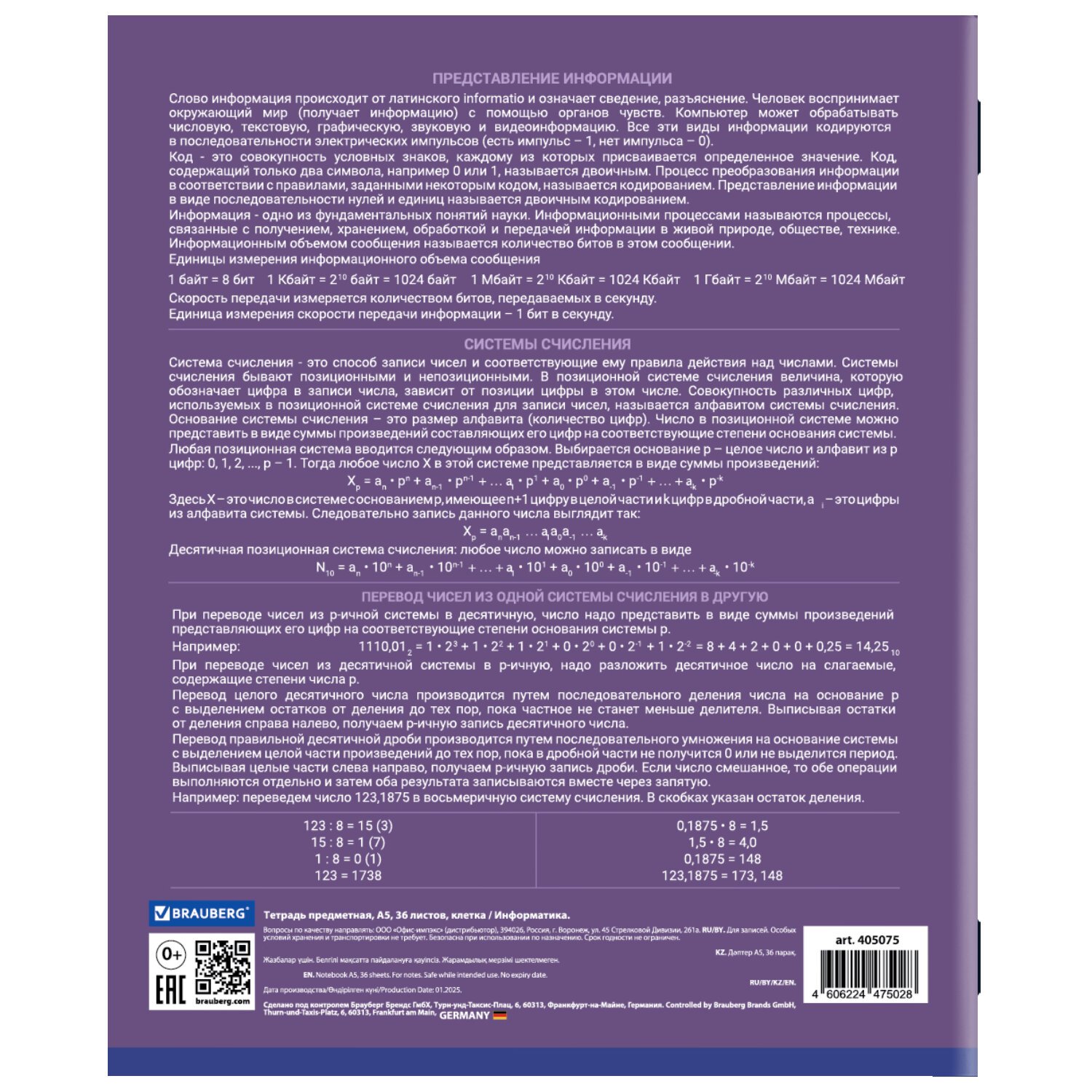 Тетрадь по информатике формата А5 (165х202 мм) содержит 36 листов, изготовленных из высококачественной офсетной бумаги плотностью 60 г/м2, 100% белизны. Листы соединены скобами. Линовка блока - клетка, красные поля. Обложка выполнена из мелованной бумаги плотностью 170 г/м2. На обратной стороне обложки расположены основные подсказки по школьному предмету.