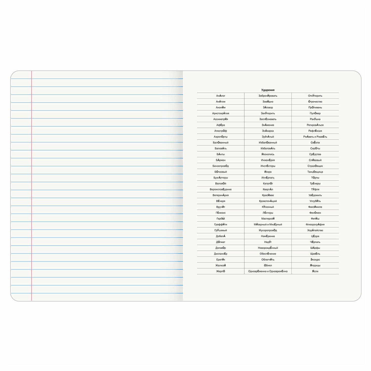 Тетрадь по русскому языку формата А5 (165х205 мм) содержит 48 листов, изготовленных из высококачественной офсетной бумаги плотностью 60 г/м2 и белизной 100%. Листы соединены скобами. Линовка блока - в линию, красные поля.