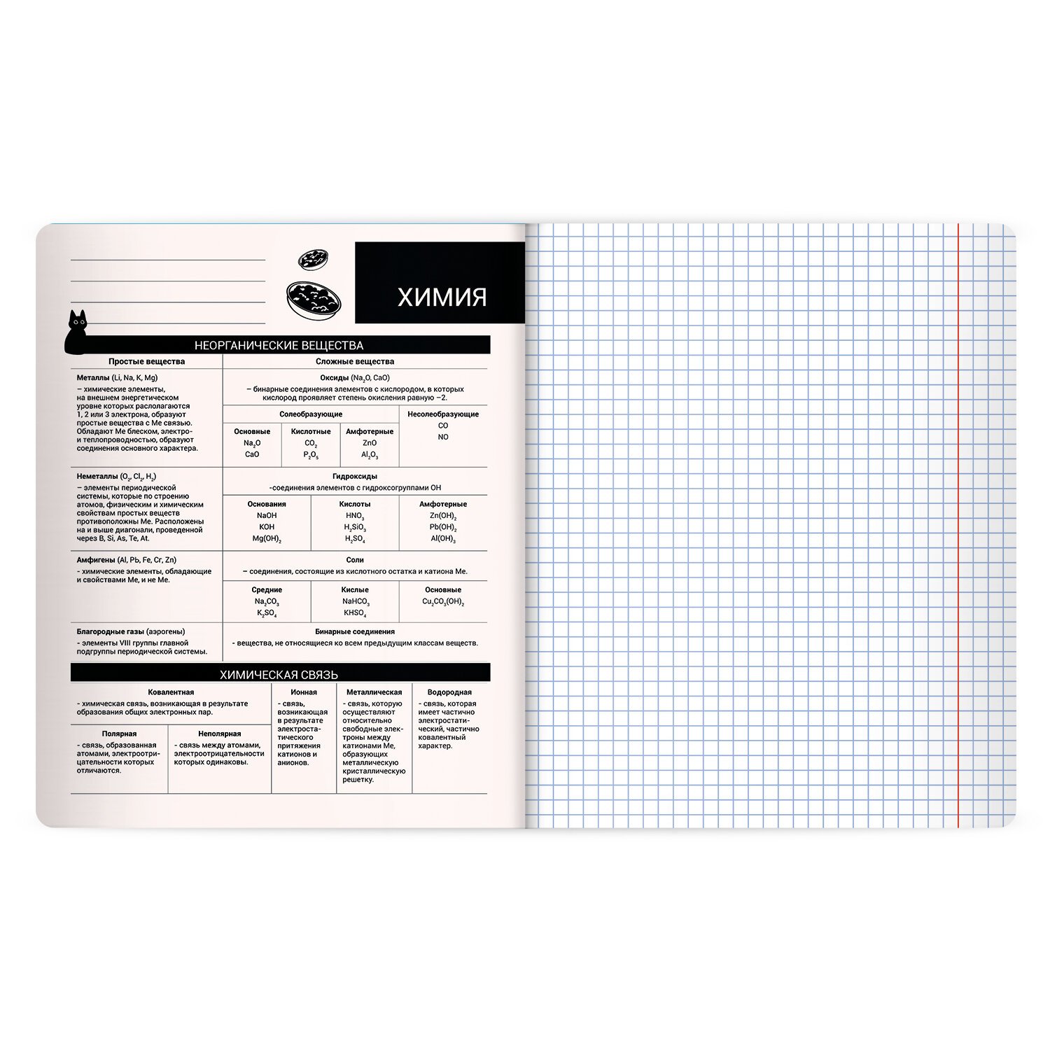 Тетрадь по химии формата А5 с двойной обложкой: внешняя выполнена из высококачественного износостойкого прозрачного пластика, внутренняя – из качественной офсетной бумаги. Преимущество таких тетрадей заключается в том, что для сохранения внешнего вида не нужно покупать дополнительную обложку. На подкладных листах содержится справочный материал по предмету. Внутренний блок плотностью 60 г/м2 из офсетной бумаги содержит 48 листов в клетку с полями. Белизна блока - 100%. Скрепка надежно соединяет листы между собой.