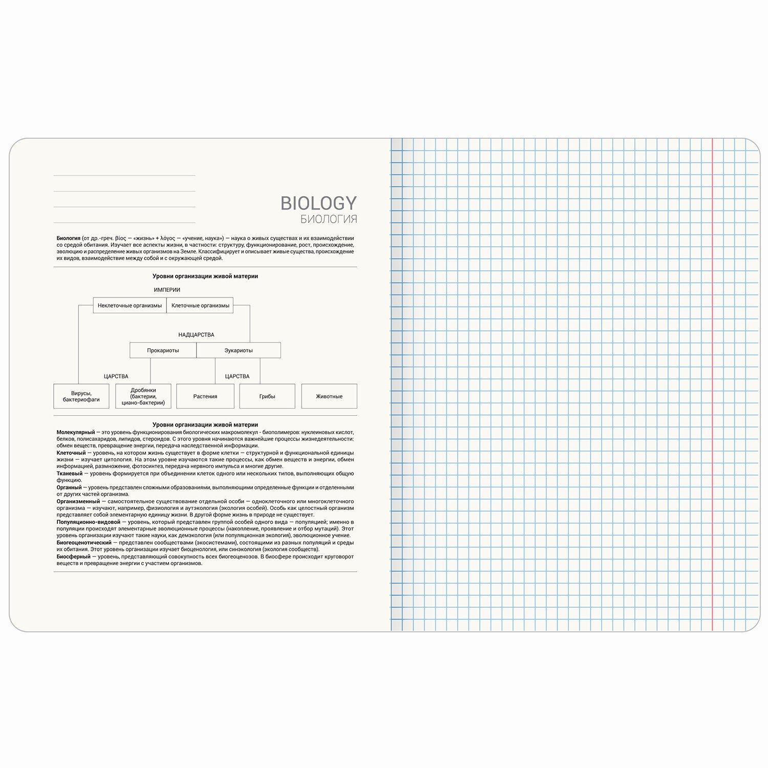 Тетрадь по биологии формата А5 (165х205 мм) содержит 48 листов, изготовленных из высококачественной офсетной бумаги плотностью 60 г/м2 и белизной 100%. Листы соединены скобами. Линовка блока – в клетку, красные поля. Обложка выполнена из мелованного картона плотностью 190 г/м2 в тематике соответствующего предмета. Спецэффект "TWIN-лак" придает изображениям оригинальность и выразительность. В справочном материале для учащихся собраны основные подсказки по школьному предмету.