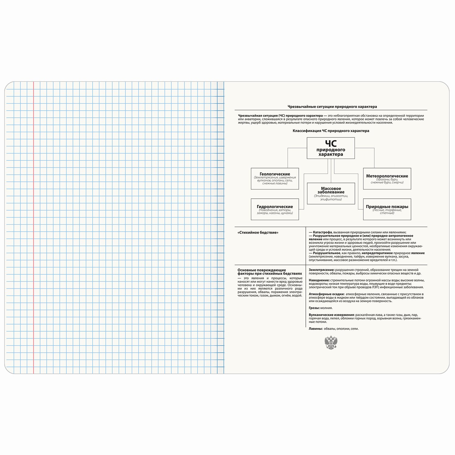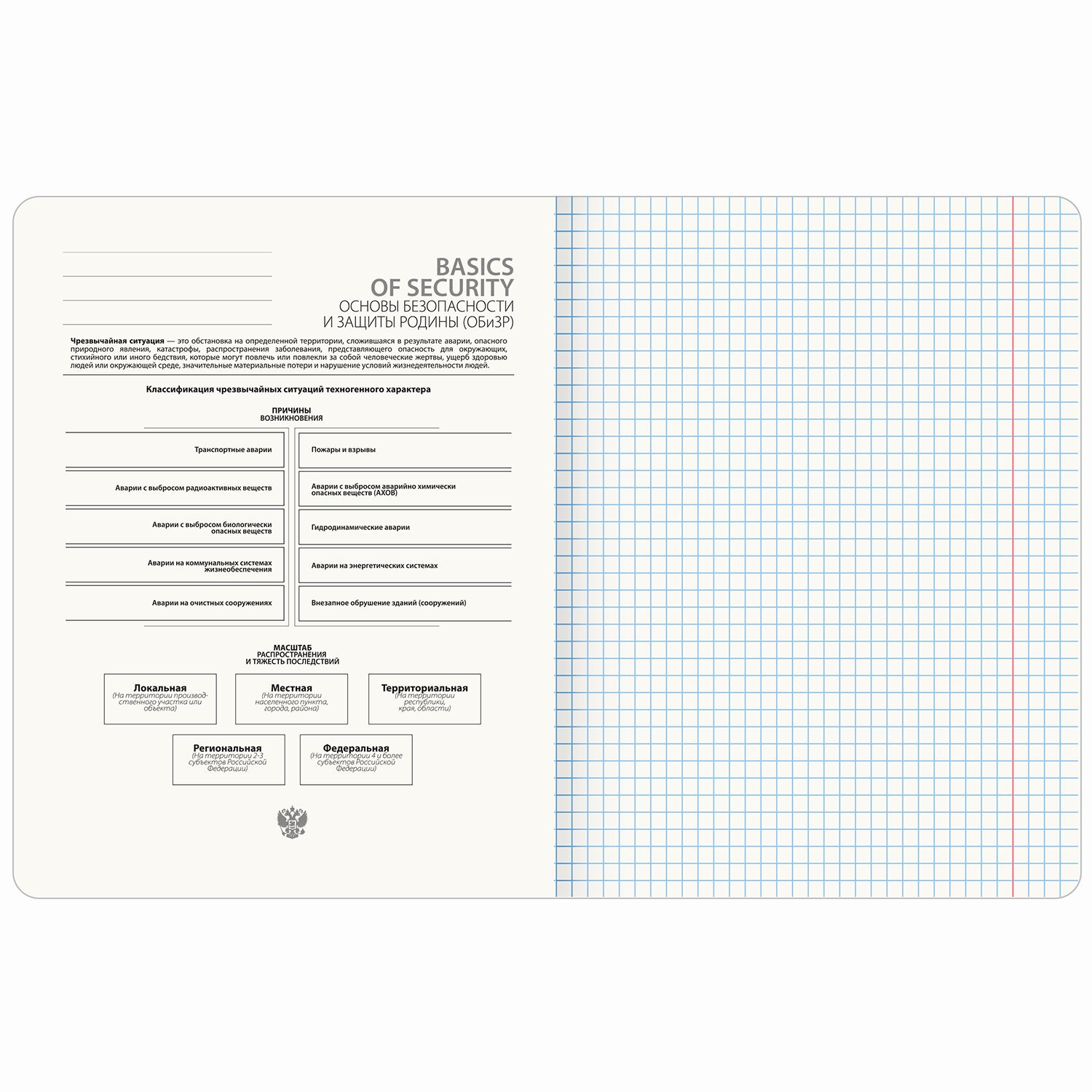 Тетрадь по основам безопасности и защиты Родины формата А5 (165х205 мм) содержит 48 листов, изготовленных из высококачественной офсетной бумаги плотностью 60 г/м2 и белизной 100%. Листы соединены скобами. Линовка блока – в клетку, красные поля. Обложка выполнена из мелованного картона плотностью 190 г/м2 в тематике соответствующего предмета. Спецэффект "TWIN-лак" придает изображениям оригинальность и выразительность. В справочном материале для учащихся собраны основные подсказки по школьному предмету.